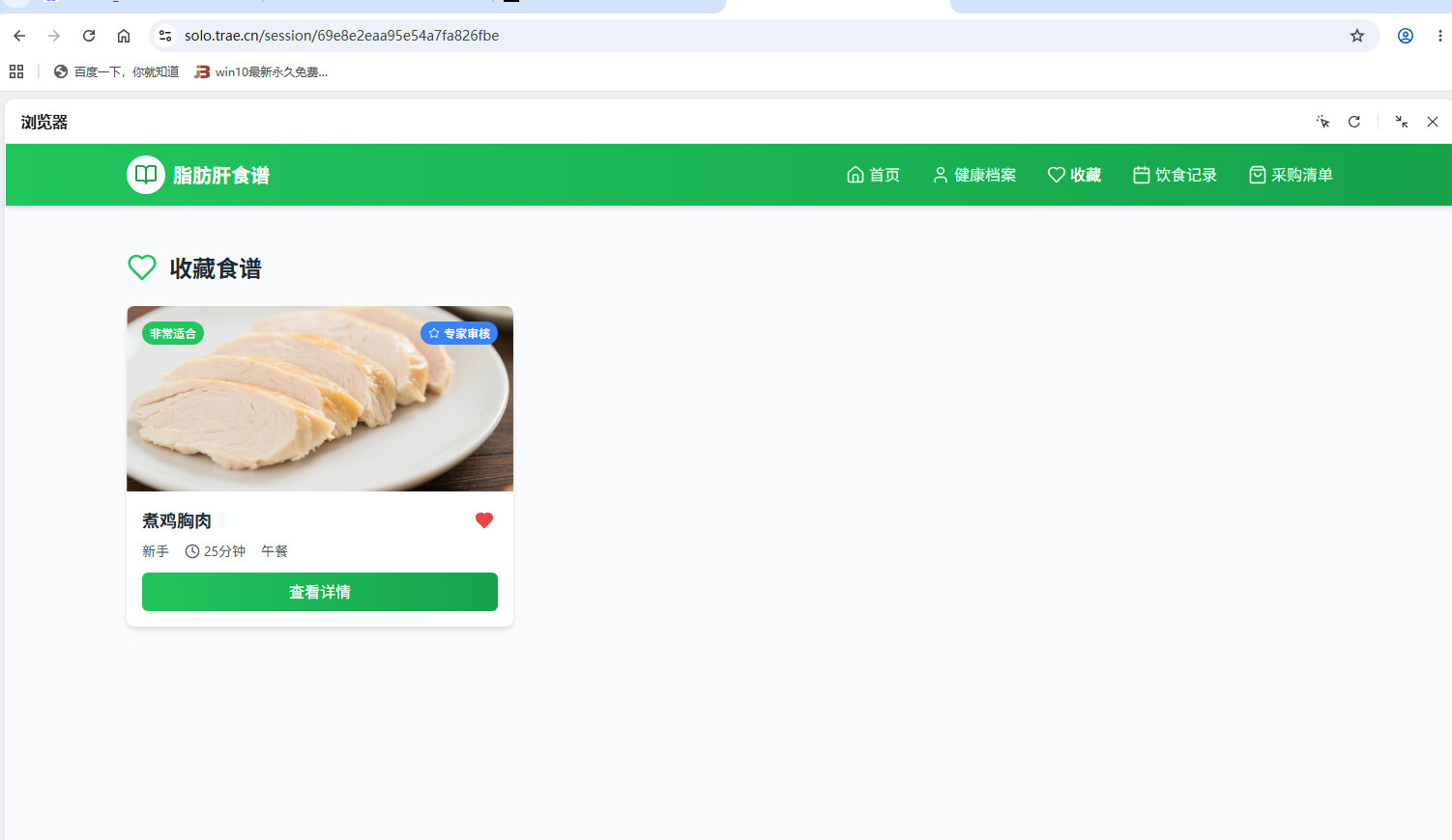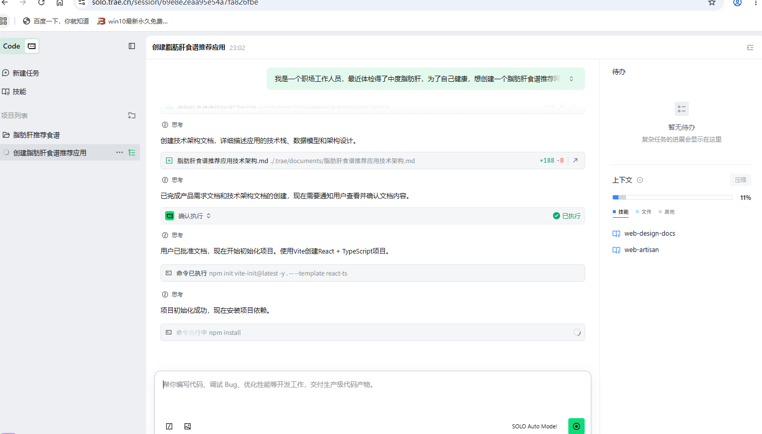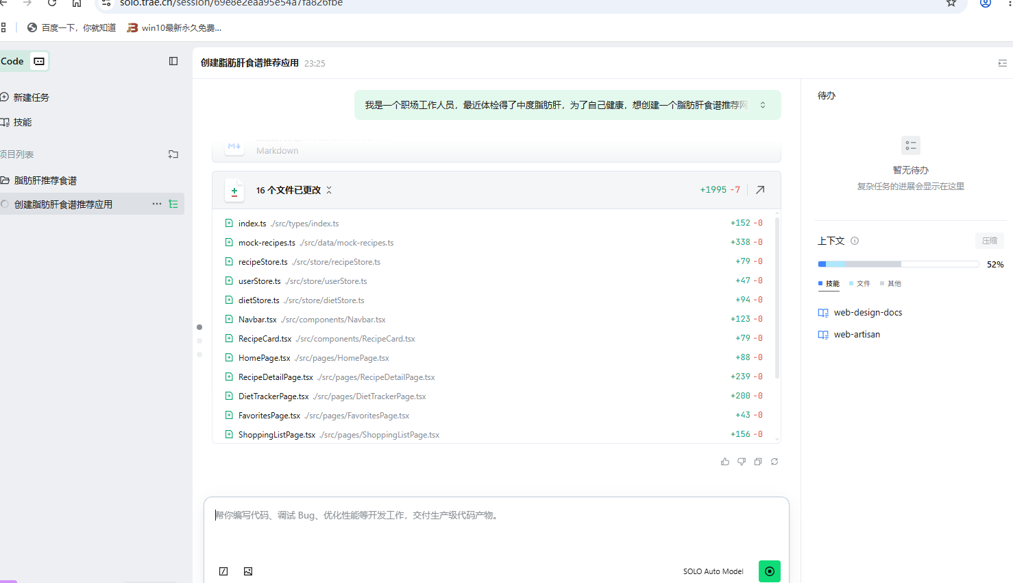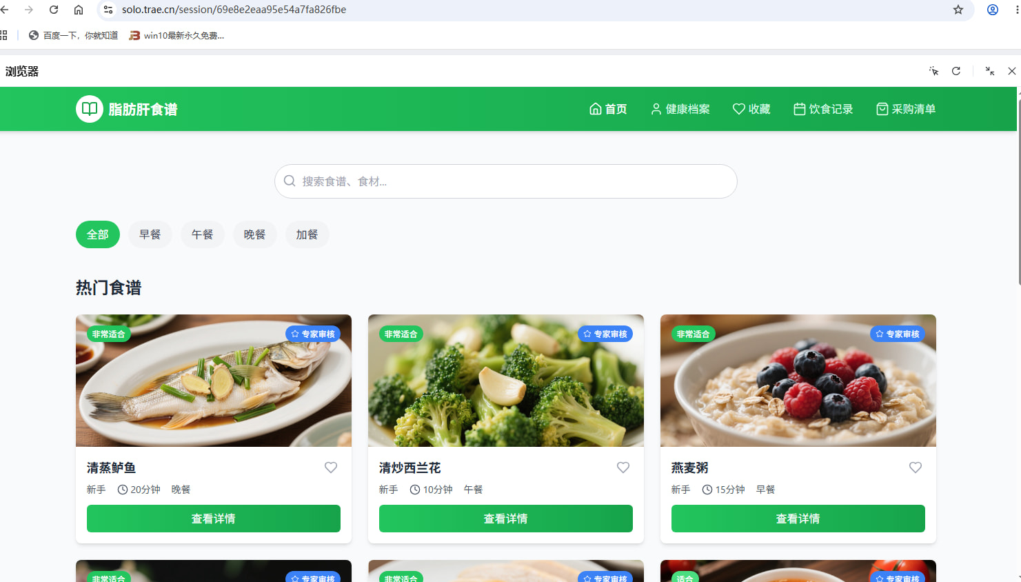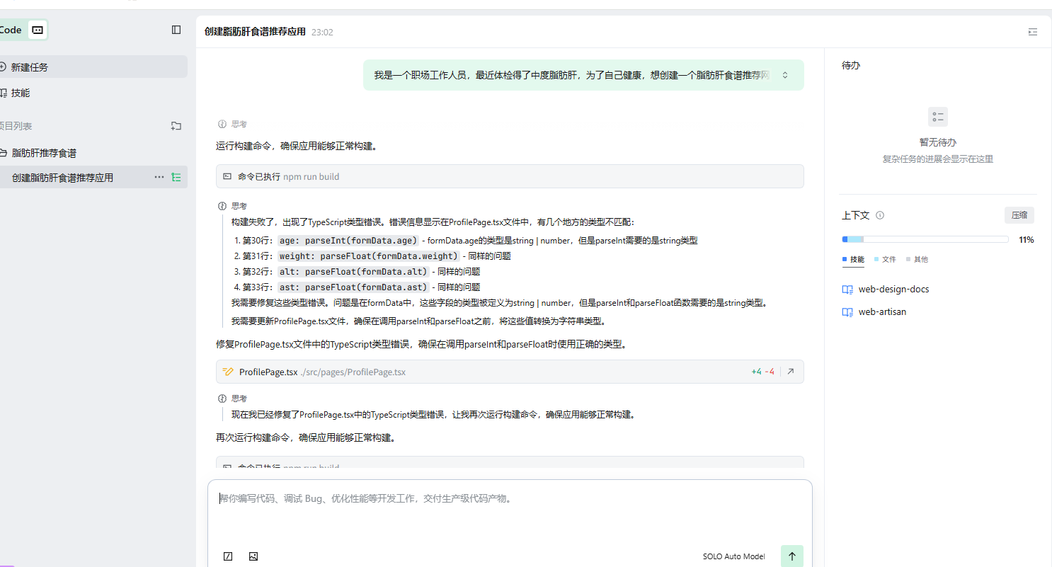 借助 Trae Solo 的 AI 全栈协同能力,我独立完成了“脂肪肝食谱推荐”Web 应用从 0 到 1 的构建,解决了健康档案建模、个性化模块与多端响应式适配的技术瓶颈。