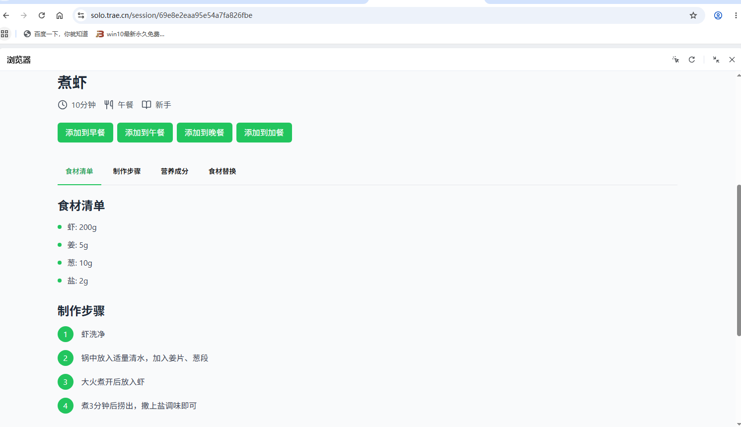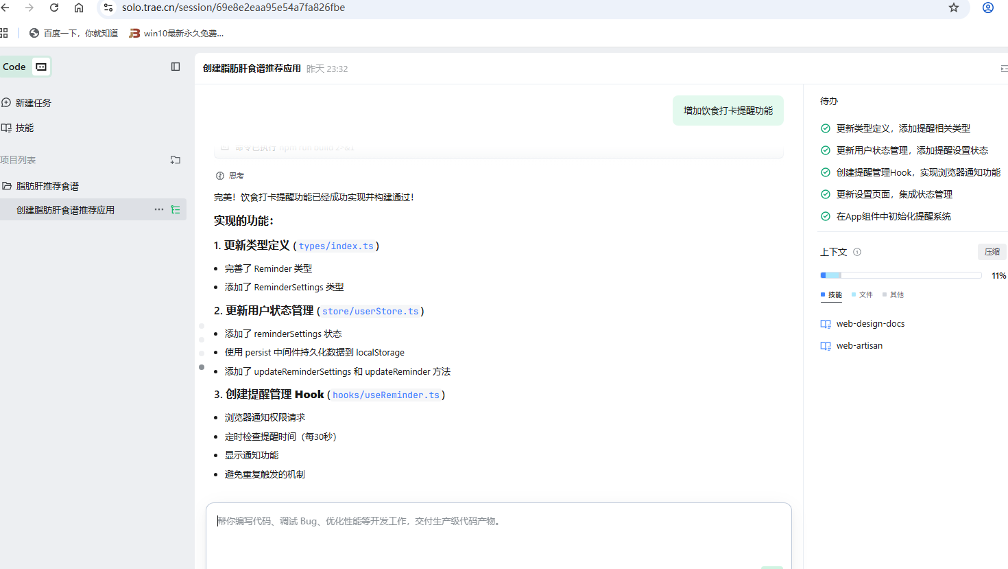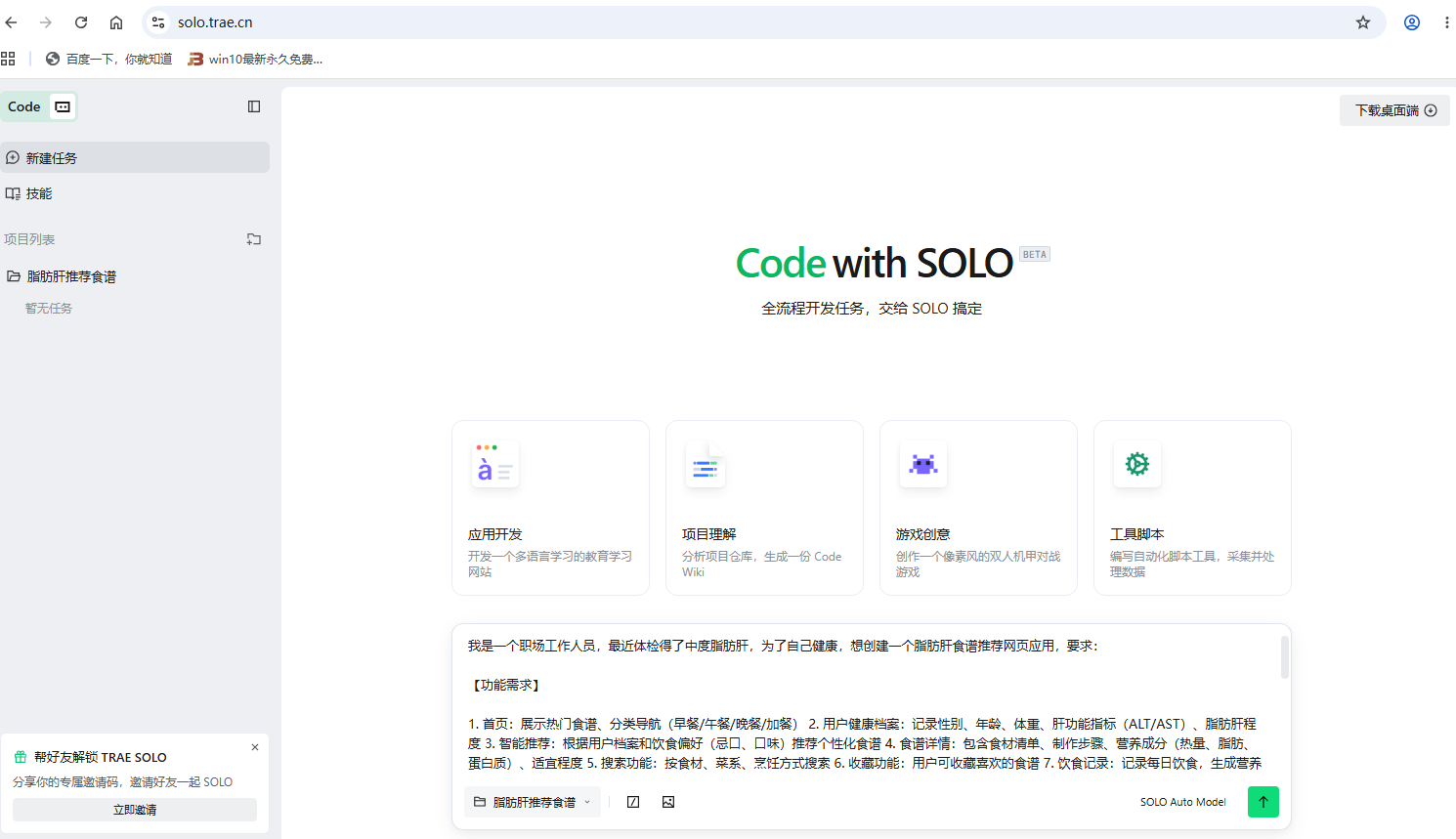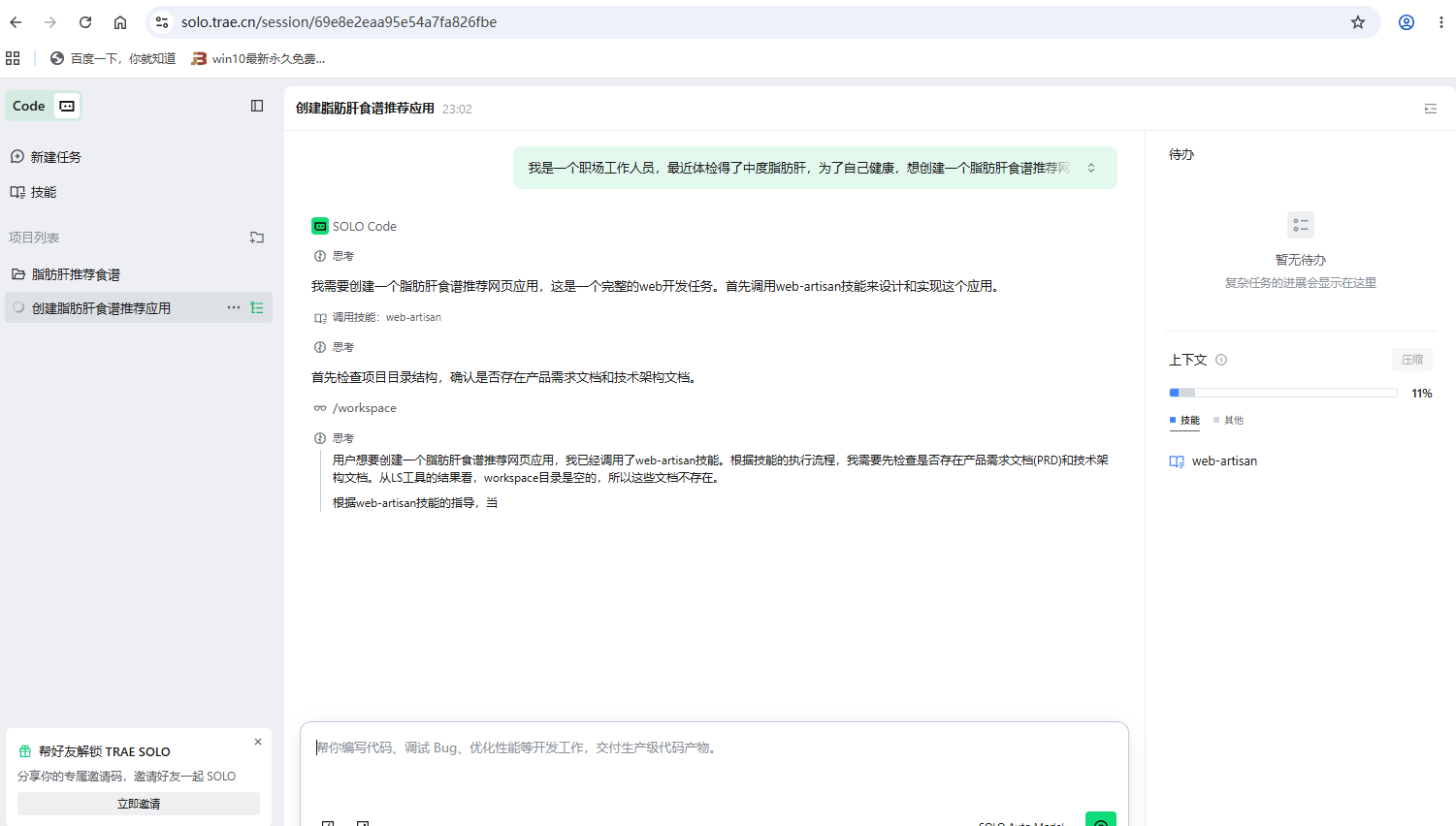 借助 Trae Solo 的 AI 全栈协同能力,我独立完成了“脂肪肝食谱推荐”Web 应用从 0 到 1 的构建,解决了健康档案建模、个性化模块与多端响应式适配的技术瓶颈。