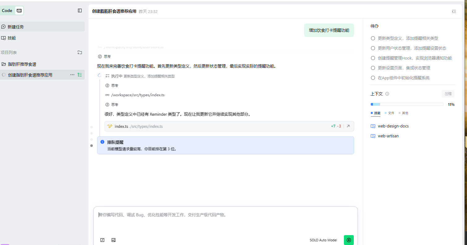 - SOLO 在流程中的角色:承担了“架构师+高级开发+测试员”三重身份。通过上下文连贯性管理,我仅需提供业务Prompt,Solo 自动完成组件拆分、状态管理、响应式适配与基础算法实现。