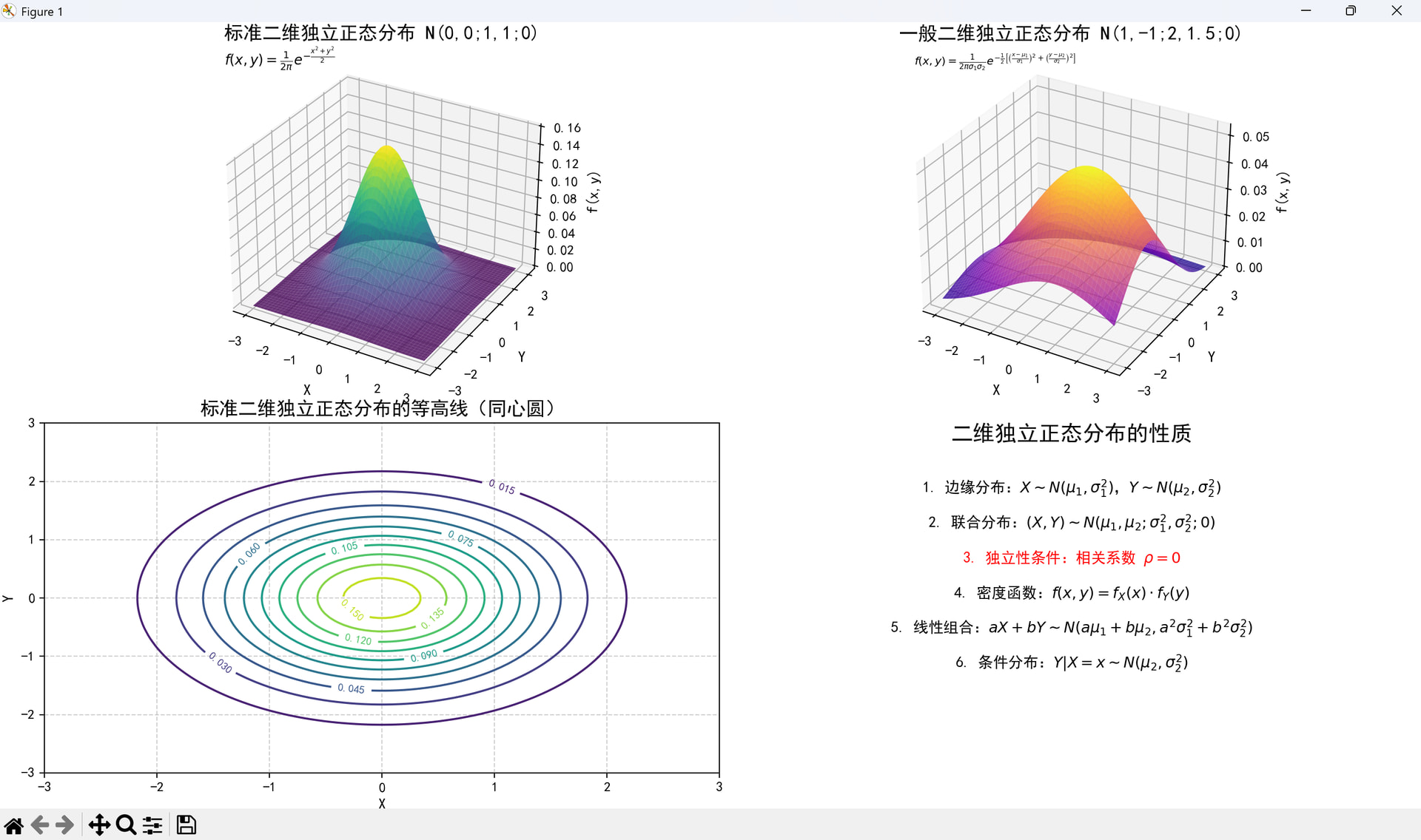 通过可视化分析,我们可以更直观地理解二维独立正态分布的结构和性质,这有助于深入掌握概率论和数理统计的相关知识。
