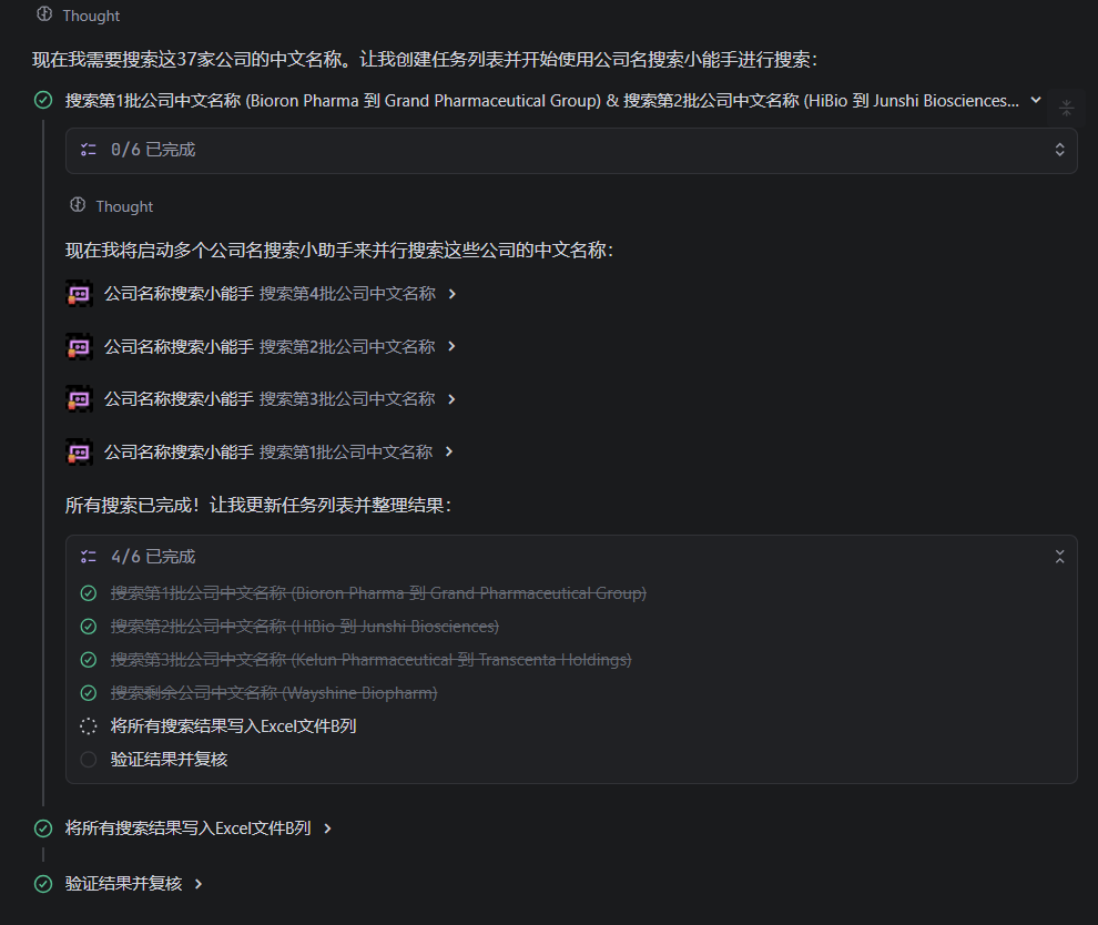 效果如下图,对于37个公司名称主Agent自行拆分了4个Sub Agent员工干活。也可以通过提示词自行调整拆分逻辑。