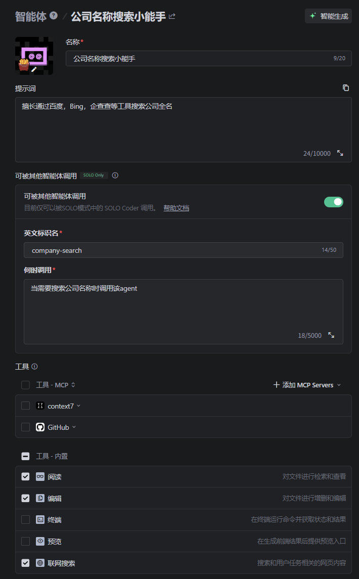 原因是由于第一次直接开工时,TRAE的SOLO Coder默认带的Sub Agent是Search Agent,它用于搜索代码,让它直接干活会强调自己不会Web搜索xx%~,浪费Token和时间。所以还是新建一个干净的Sub Agent更便利。提示词和何时调用简单描述即可,最重要的是勾上工具里的"联网搜索"。
