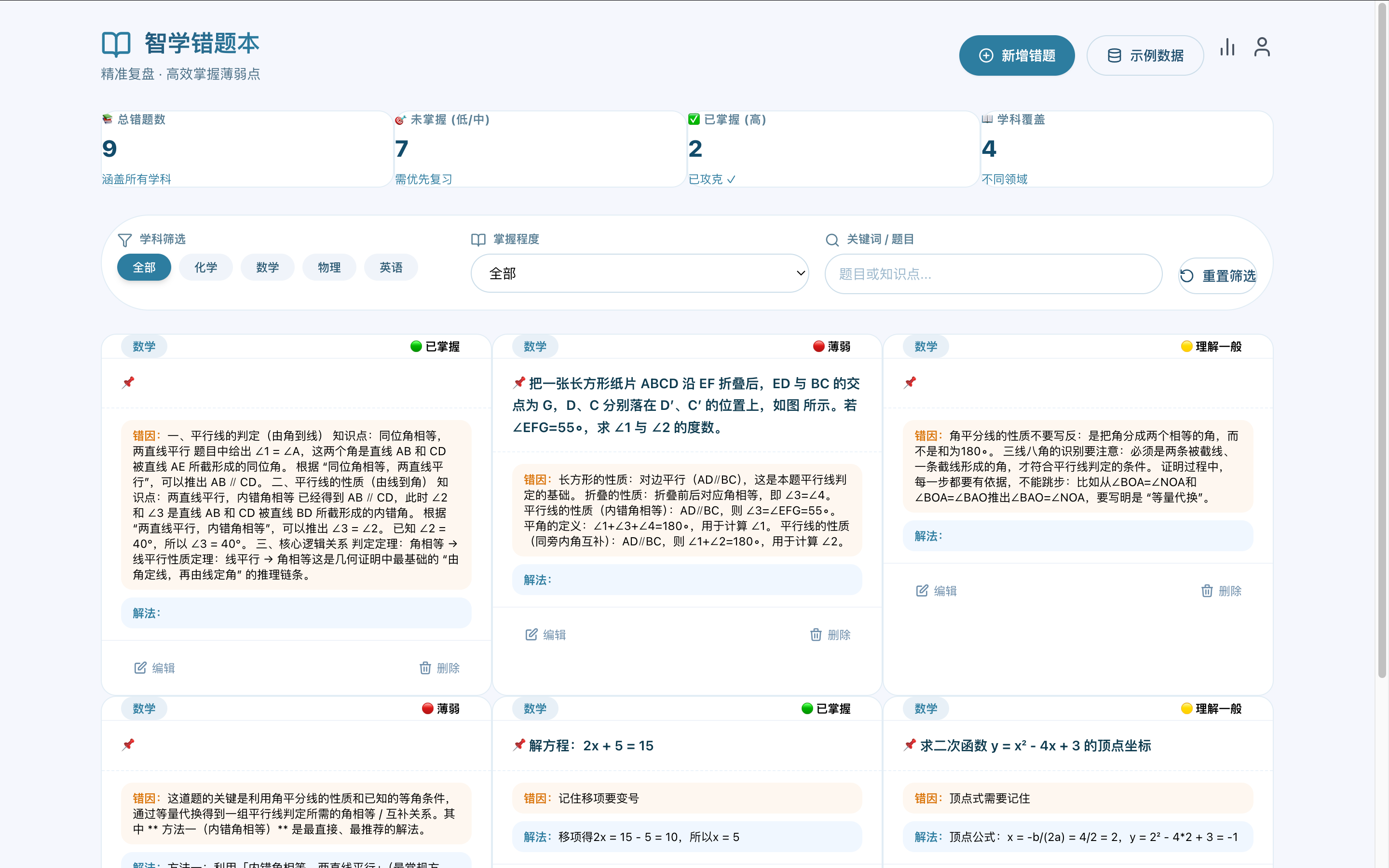 支持多学科错题录入,既能手动输入,也能拍照识别;
