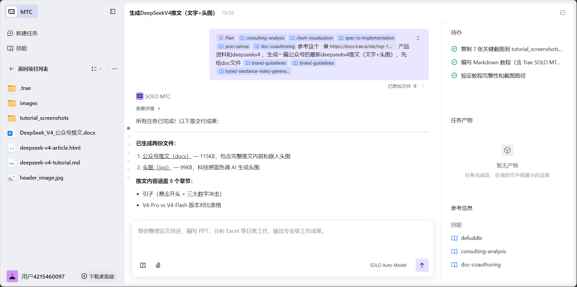 整篇推文从资料准备到最终输出,全程在 Trae SOLO MTC 模式下完成。我做的事情只有: