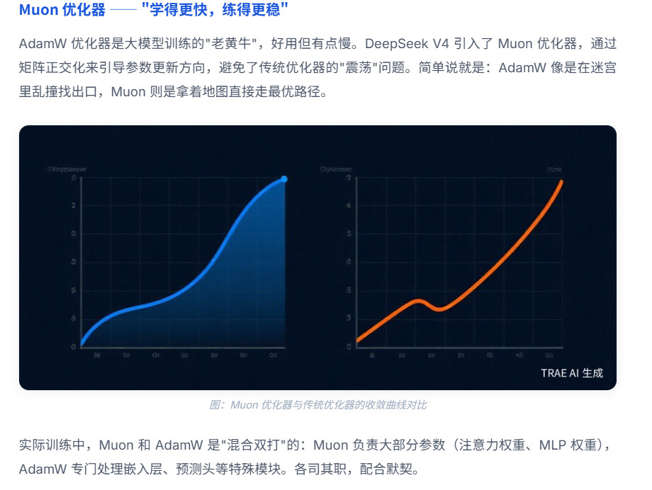 | Muon 优化器 | 两条收敛曲线对比,一条平滑一条震荡 | — |