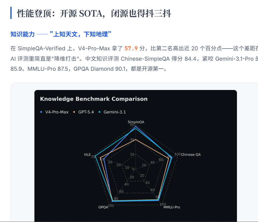 - 知识能力雷达图:V4-Pro-Max vs GPT-5.4 vs Gemini-3.1-Pro 多维度对比