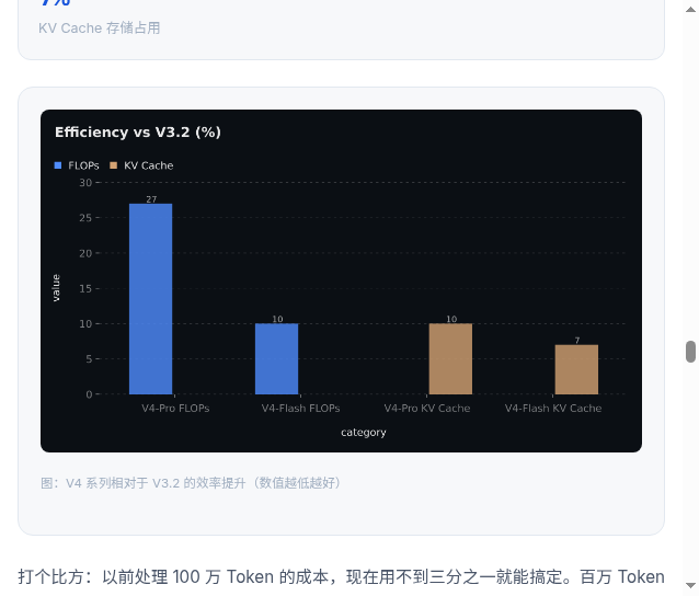 数据图表的好处是:读者可以直观看到差距。比如 V4-Flash 的 FLOPs 只有 V3.2 的 10%——这个数字写在文字里不痛不痒,但放在柱状图里,差距一目了然。