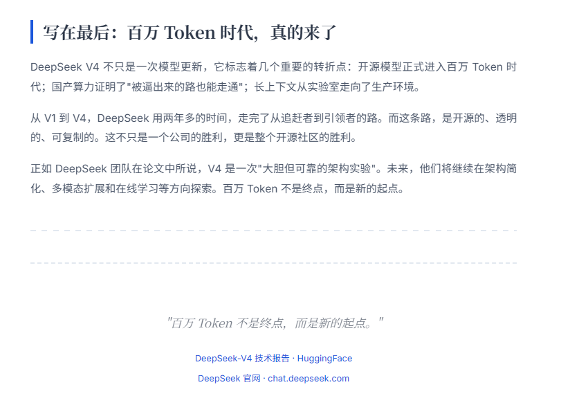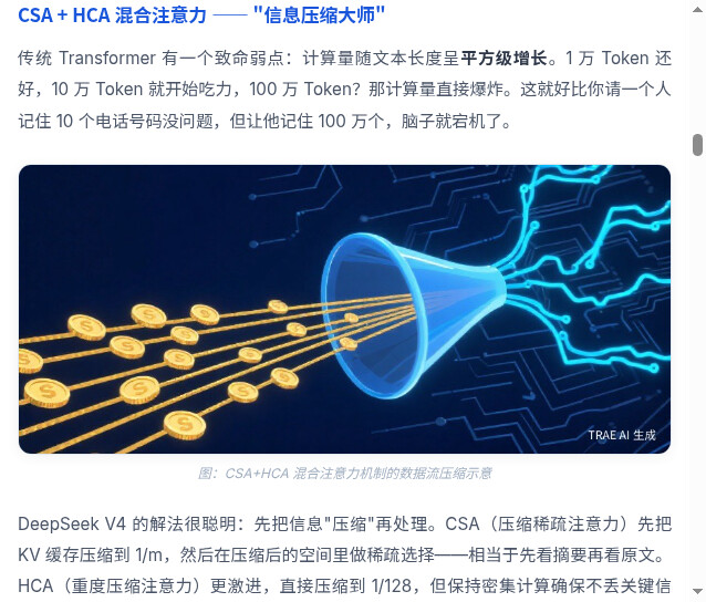 - 五大技术亮点:CSA+HCA、mHC、Muon、FP4、国产算力——每个都用通俗比喻解释