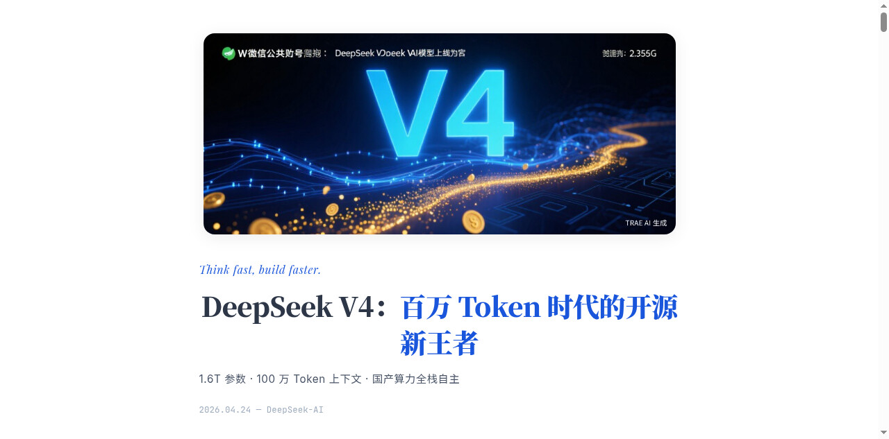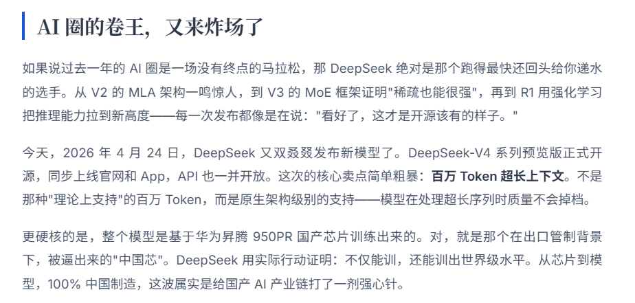 2026 年 4 月 24 日,也就是今天,中午刷到了DeepSeek 发布了 V4 系列预览版——1.6T 参数、100 万 Token 上下文