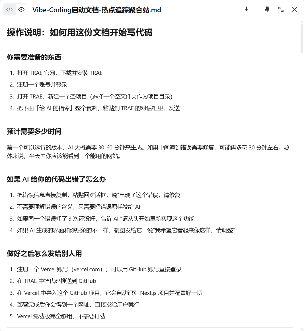 选完技术栈后,SOLO 自动生成了一份Vibe Coding 启动文档,把整个项目的技术架构、目录结构、开发步骤都规划好了。拿着这份文档,后面的开发就有了清晰的路线图。