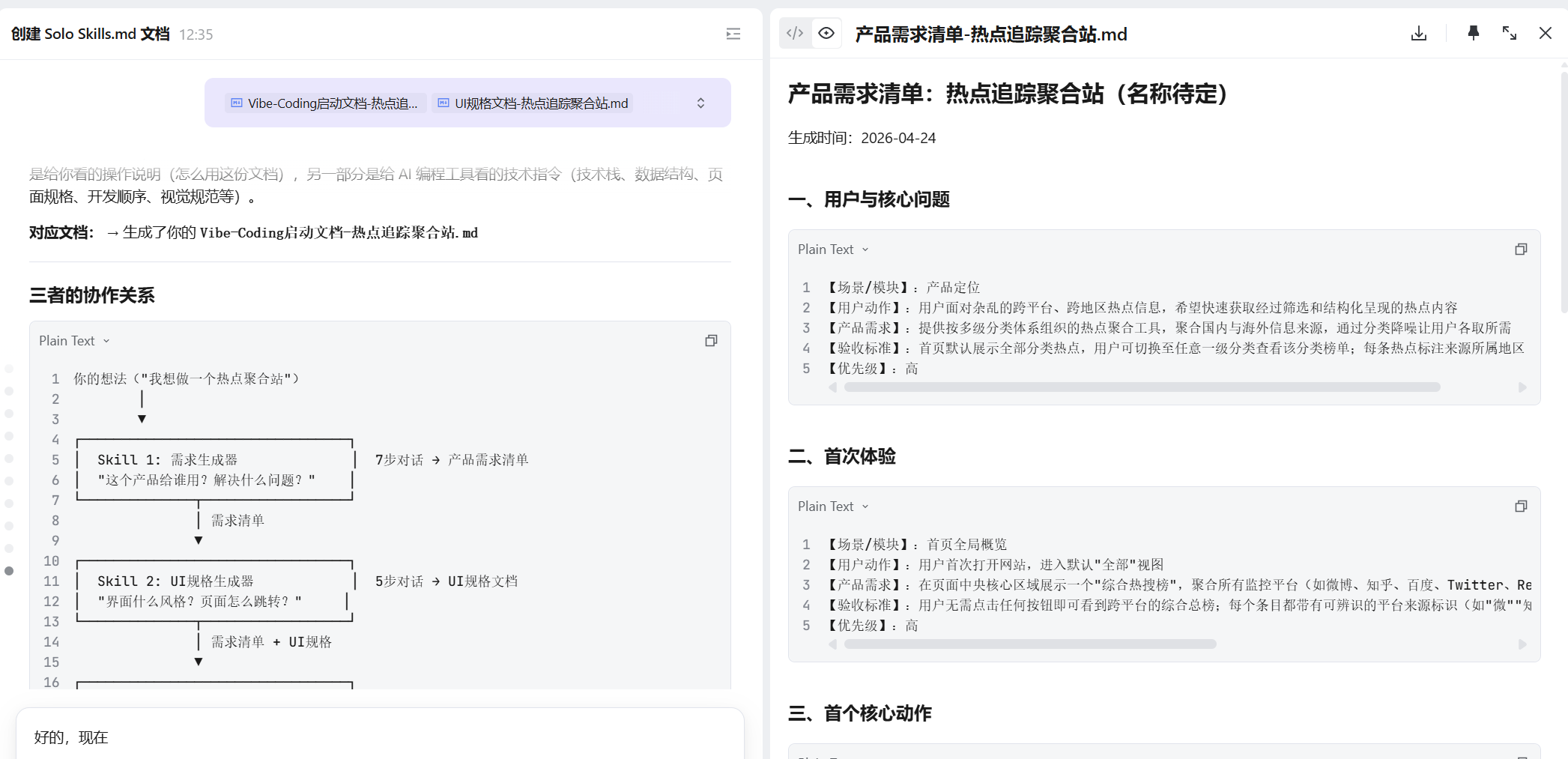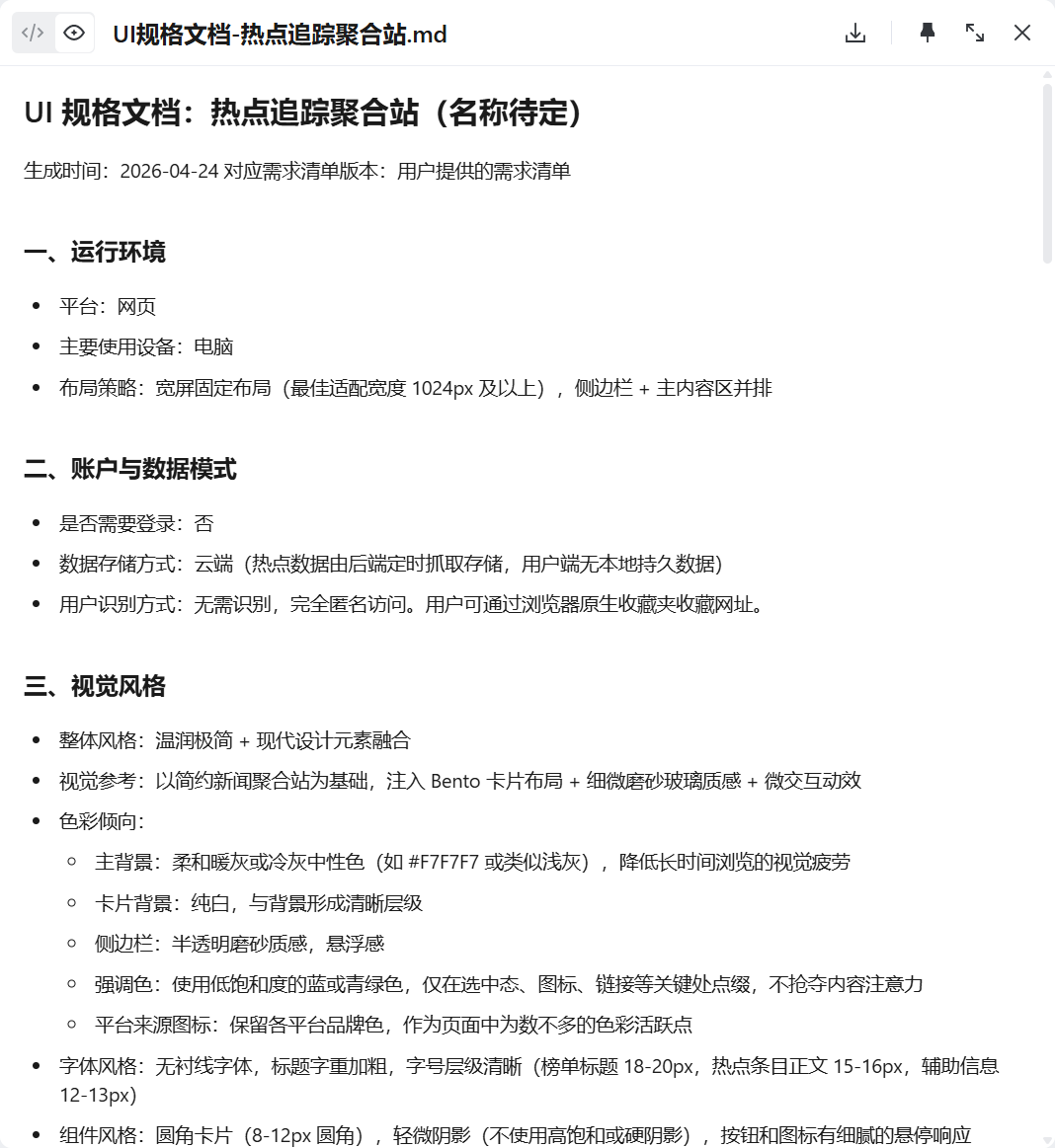 我通过对话让 SOLO 帮我生成了一份完整的产品需求清单,包含 10 个核心需求:多平台聚合、分类筛选、实时刷新、响应式布局等等。接着又生成了一份UI 规格文档,把每个页面的布局、组件、交互状态、视觉风格都定义清楚。