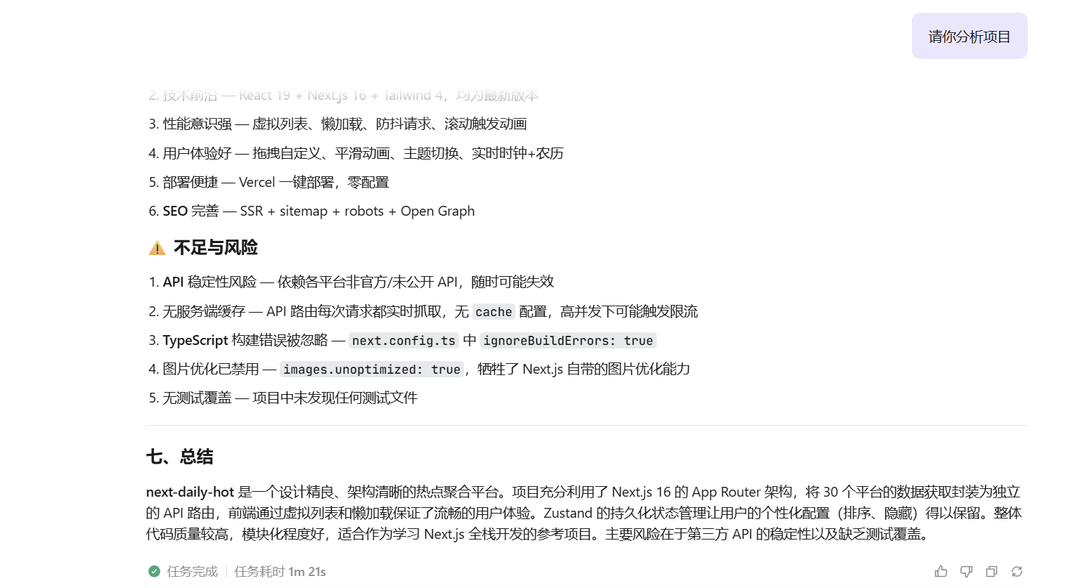 这一步很重要,我告诉 SOLO 我要接入尽可能多的平台热搜数据,不要模拟数据,不要硬编码。SOLO 主动去网上调研了多个开源项目(包括 GitHub 上的 DailyHotApi、next-daily-hot 等),最终整理出了 30+ 个平台的数据源,每个都有真实的 API 接口地址和解析方案。