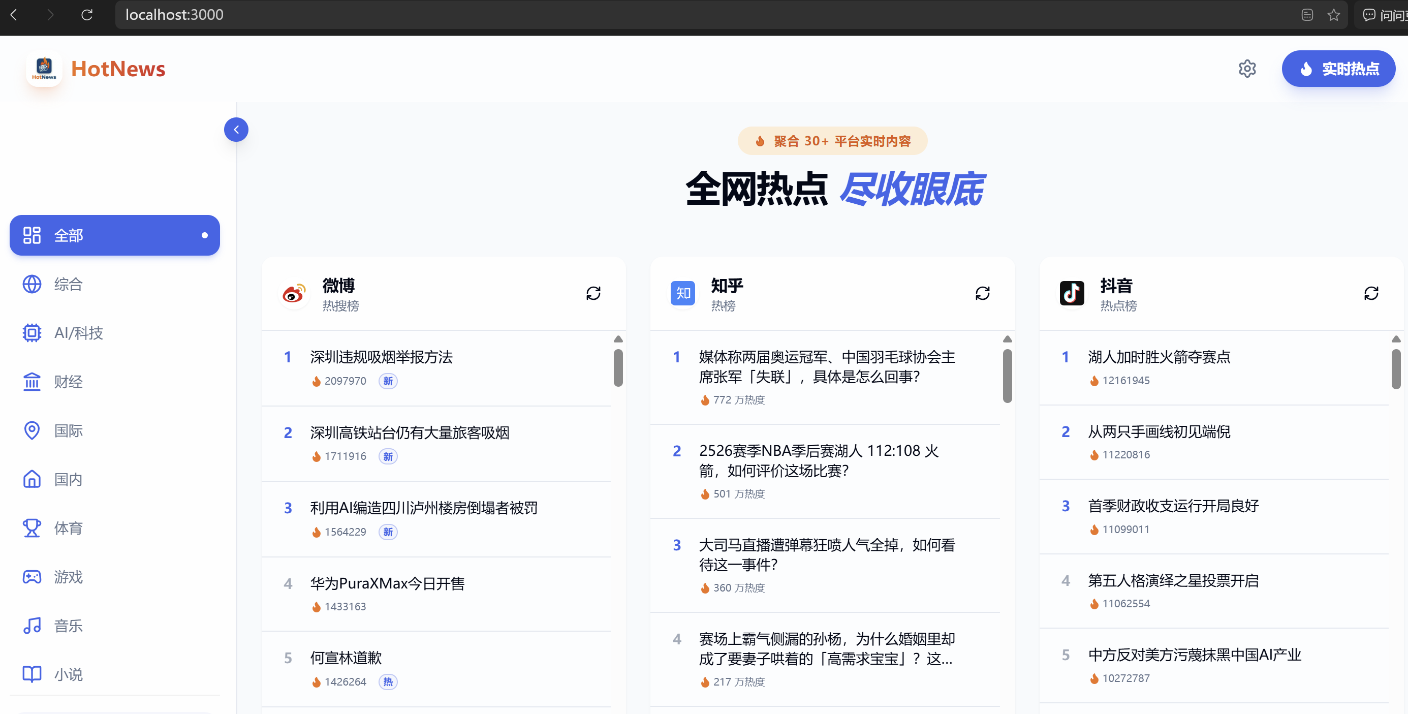 | 微博、知乎、B站、抖音、GitHub 等 30+ 平台实时数据 | |