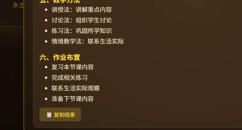 1. 教案备课助手:输入年级/学科/课题,自动生成适配乡村课堂的教案、重难点拆解、课堂提问;