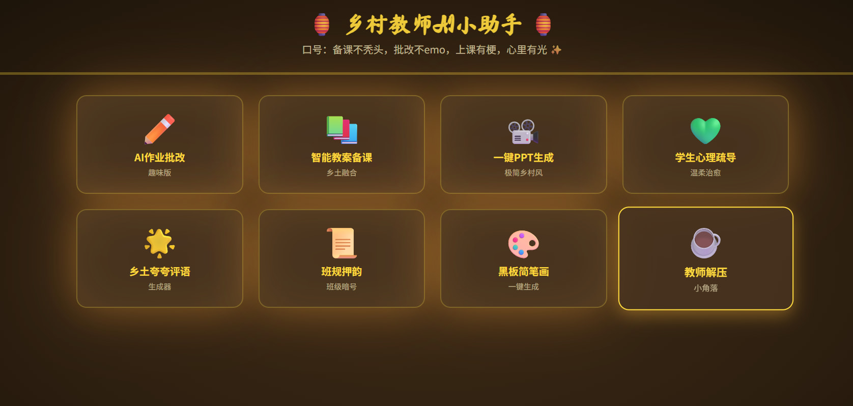 网站定位:乡村教师专属小众趣味工具,口号「备课不秃头,批改不emo,上课有梗,心里有光」。