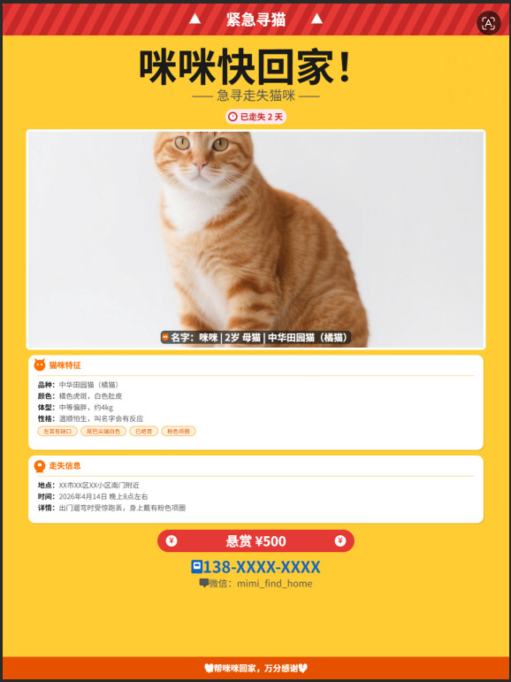 - 信息结构化:猫咪特征卡片 + 走失信息卡片 + 联系方式 + 二维码占位