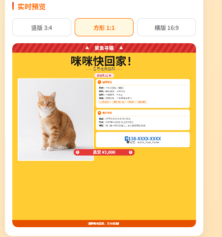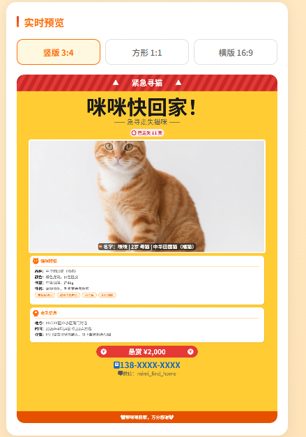 面向宠物走失家庭,在紧急寻宠场景下提供一键生成多平台适配寻猫海报的能力,目前通过生成 3 种尺寸高清海报 + 可编辑 PPT 模板 + A4 打印 PDF 验证有效,全程零设计门槛,手机端即可操作。