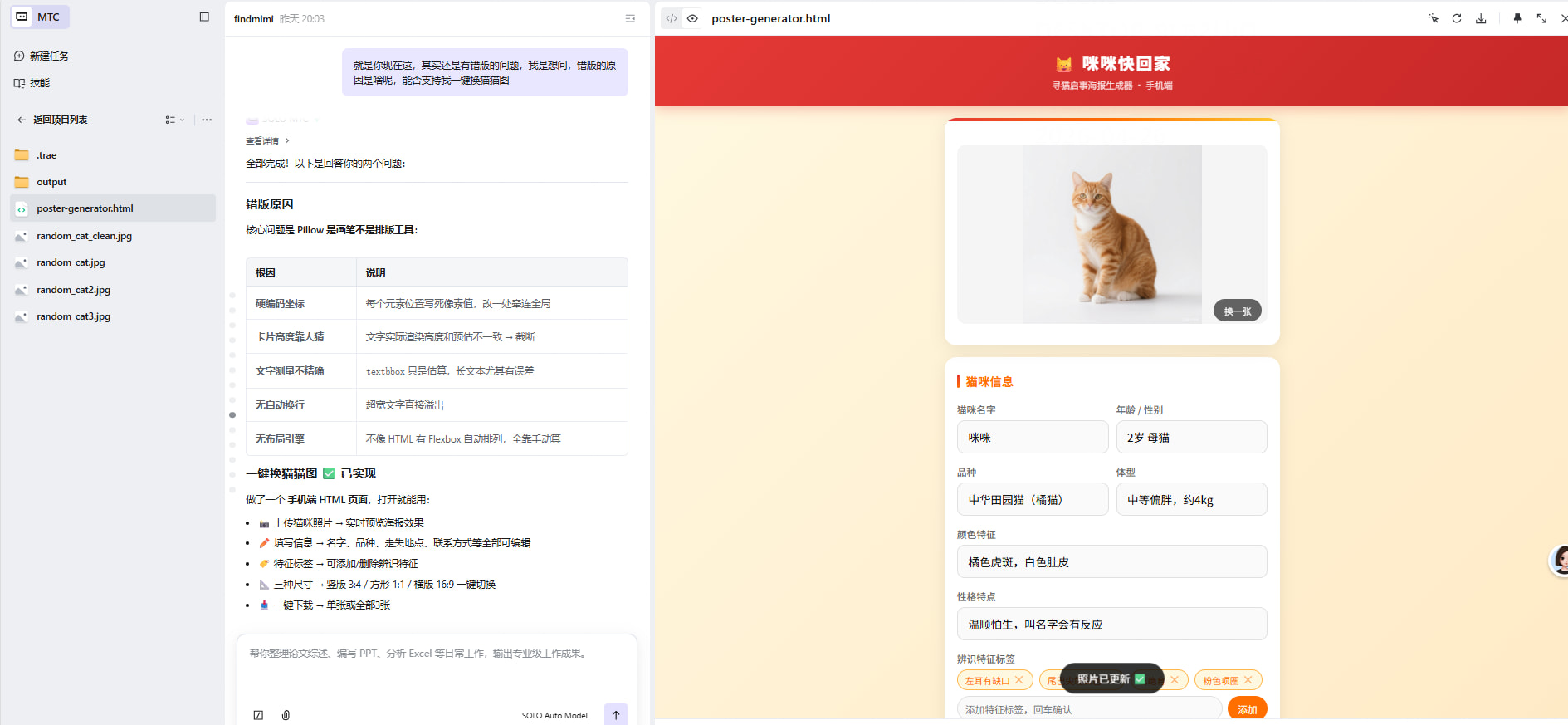 【Hello AI 科技致善】用 SOLO 打造「咪咪快回家」AI 寻猫海报生成器 —— 让每一只走失的猫咪都能回家
