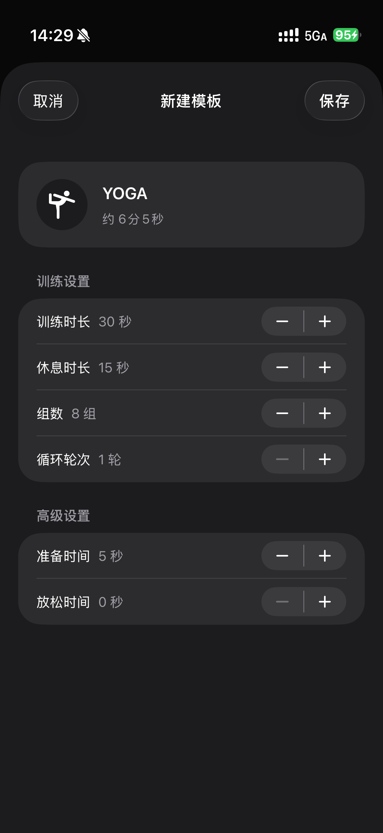关键操作:让 SOLO 根据“古法健身 60s/5s×10组”自动计算预计时长(10分55秒),生成模板列表与周热力图布局。