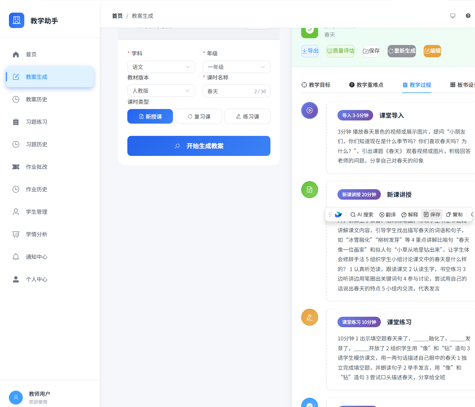 根据输入的教学主题、年级、科目,AI自动生成完整教案