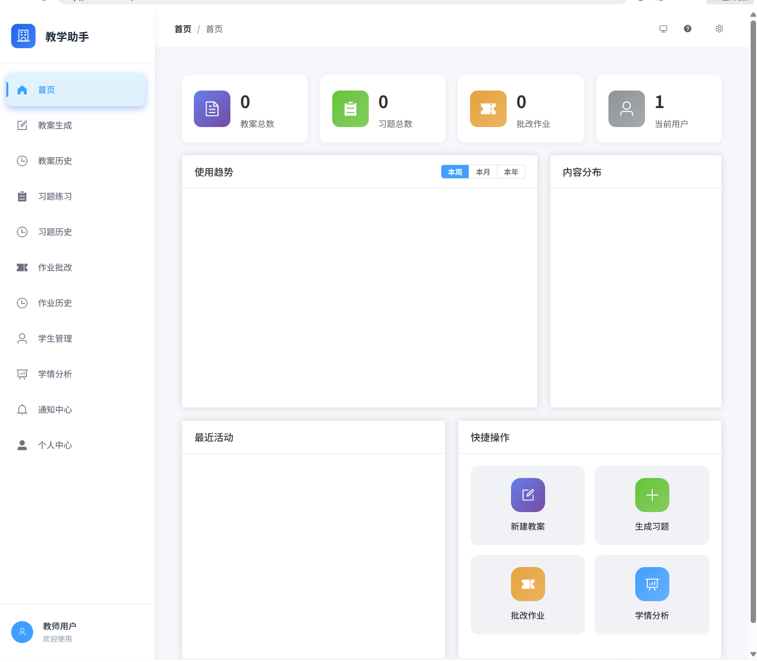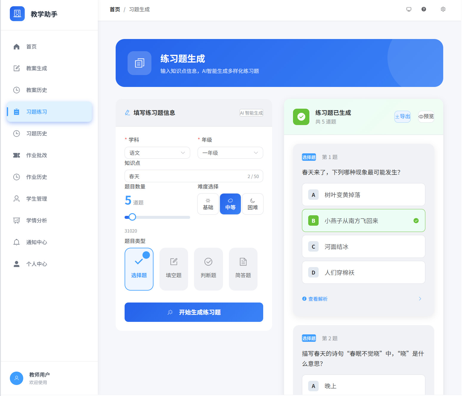 面向中国乡村教师群体,在日常教学场景下提供AI辅助教案生成、习题练习、作业批改等核心教学能力,目前通过功能测试验证系统可正常运行,有效降低乡村教师备课时间和教学压力。