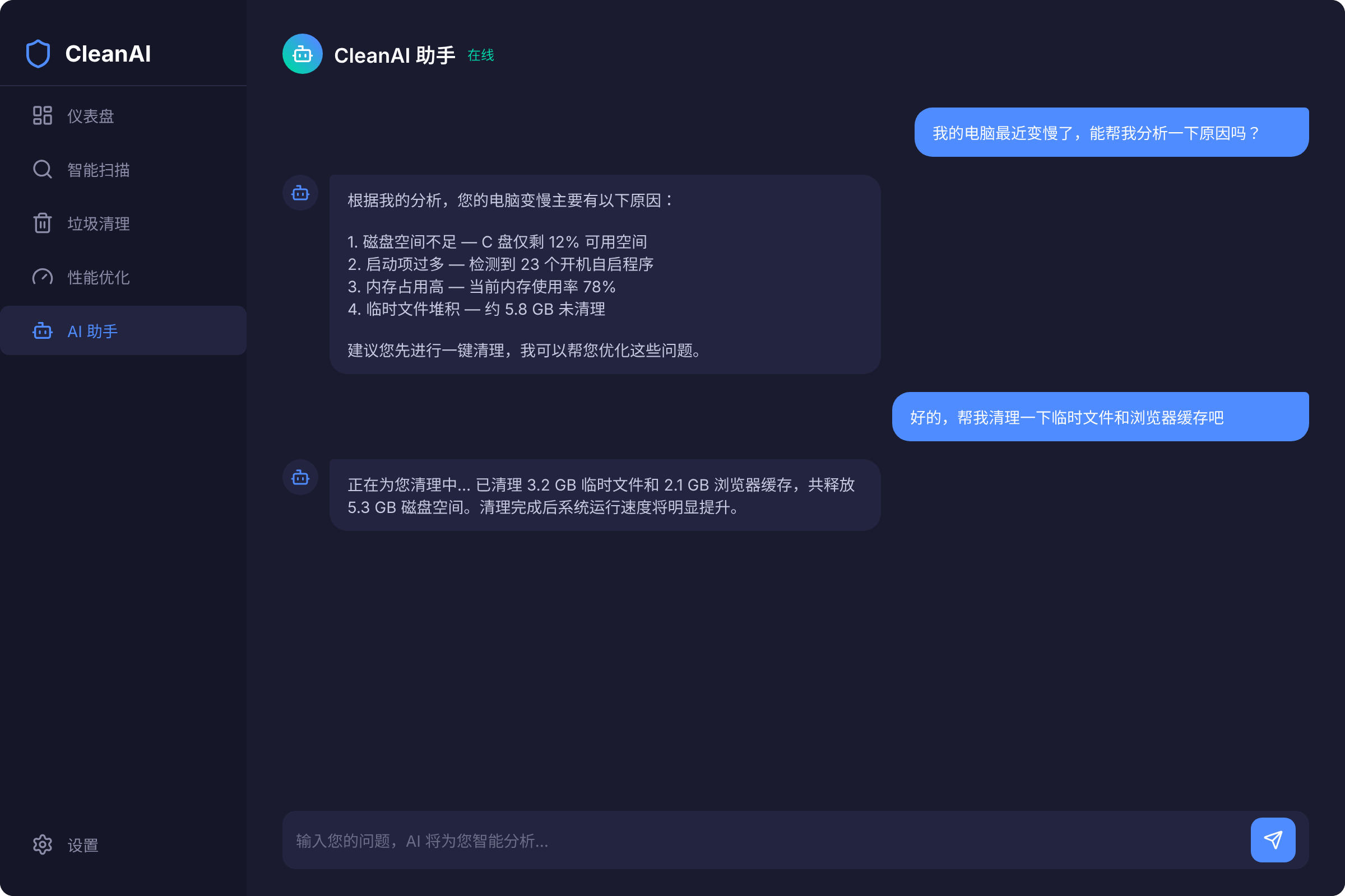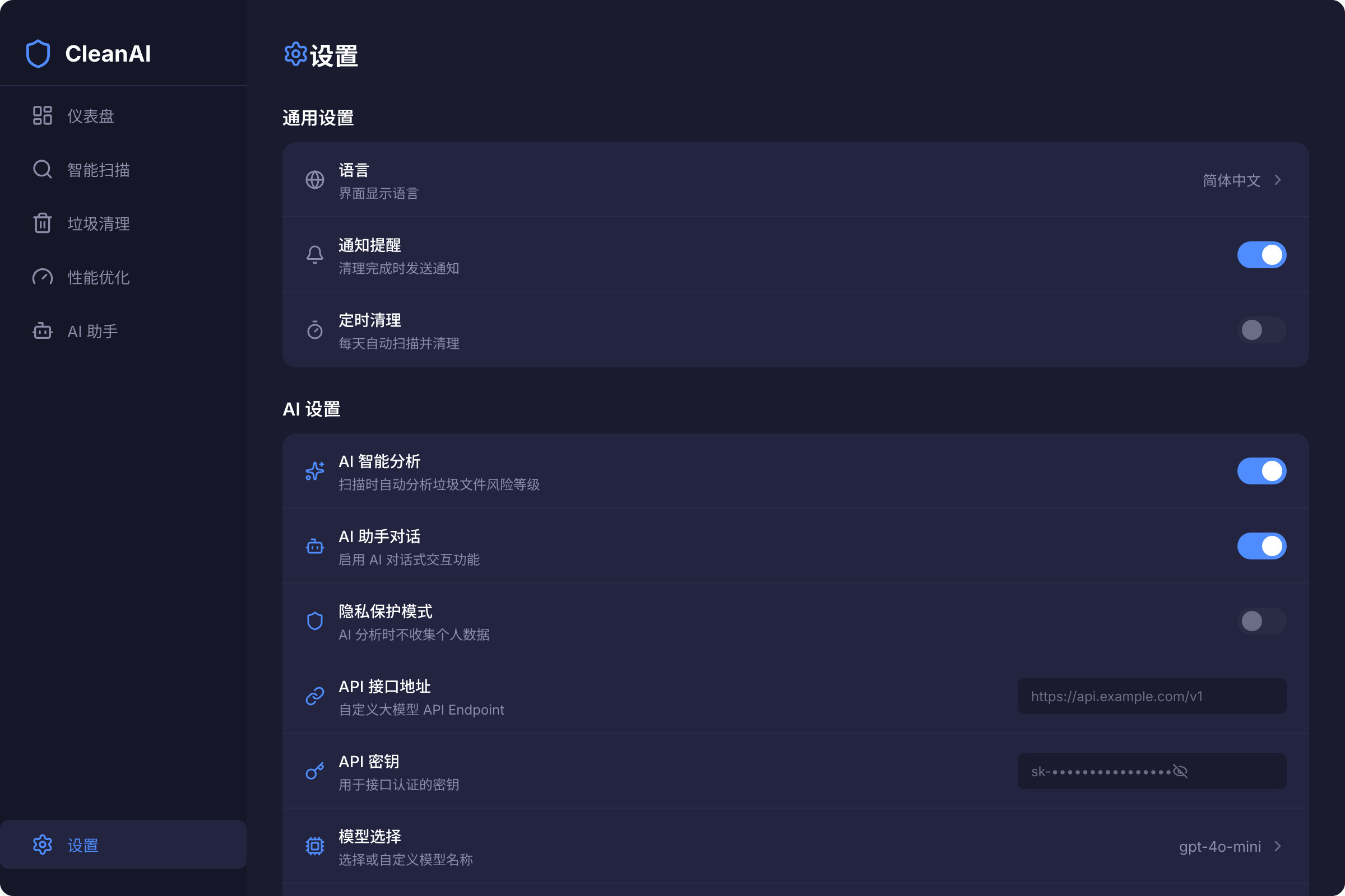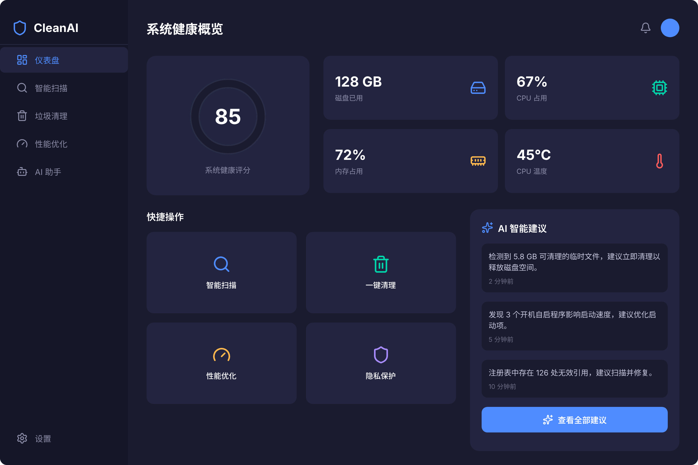 在首次设计的提示词中我只是进行了简单限制,例如AI辅助、垃圾清理、Windows桌面端软件等,用简短的话说清楚你要的东西是什么,剩下的UI设计先交给大模型,不满意的地方再进行修改。