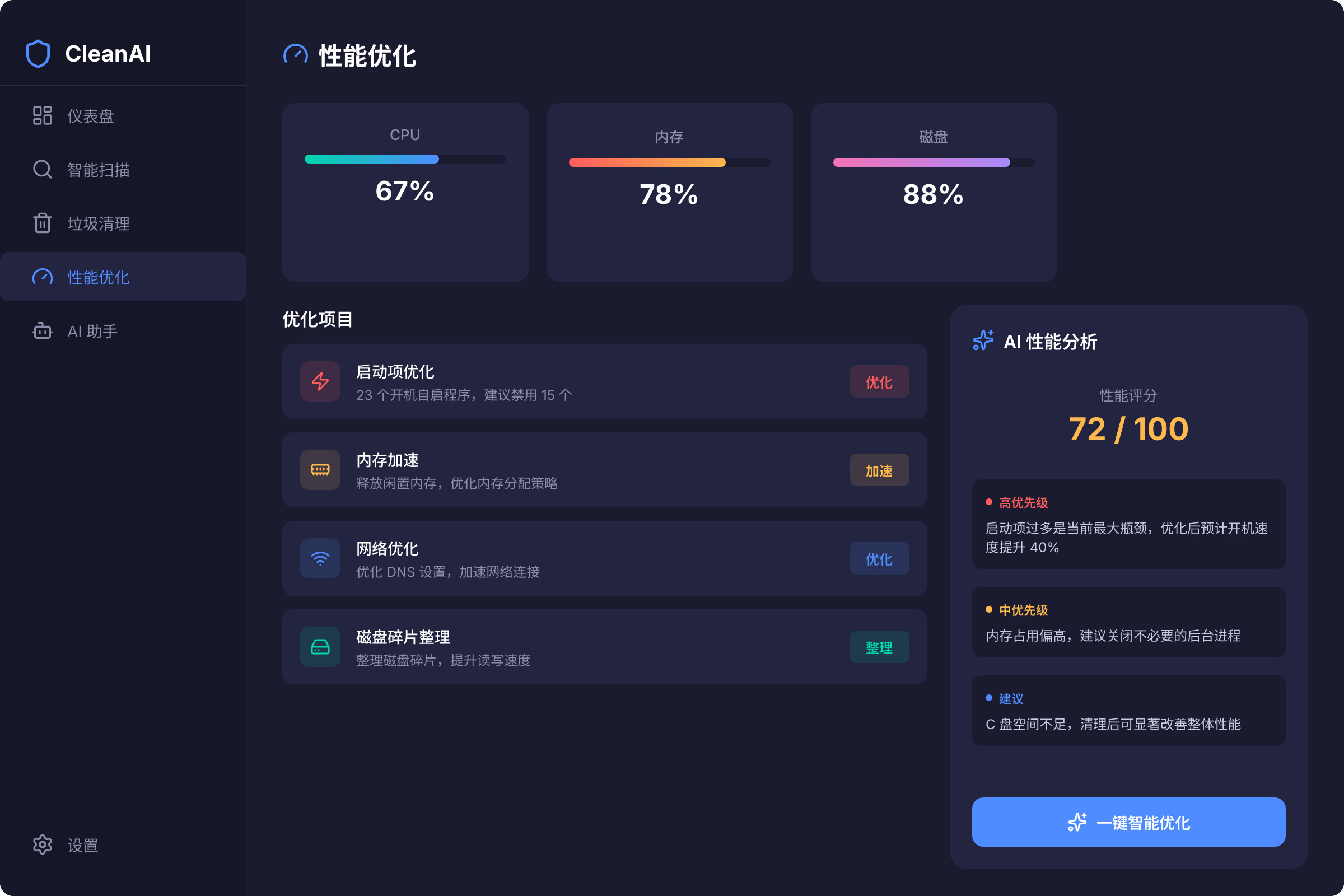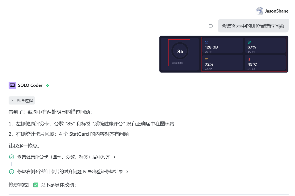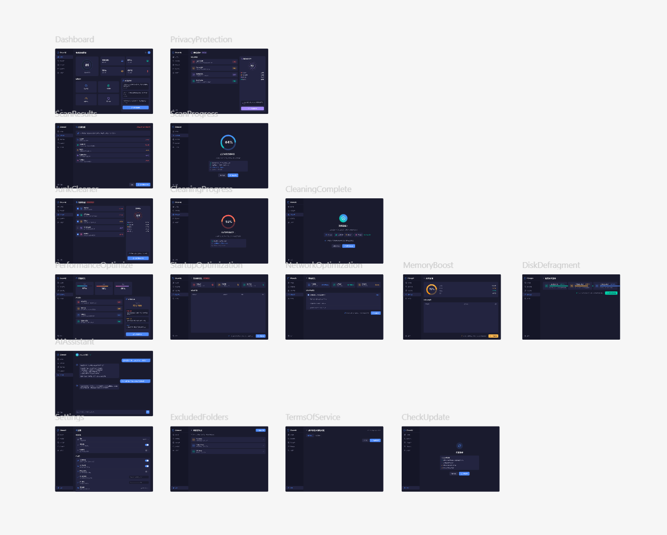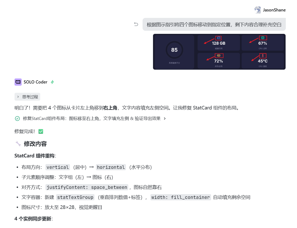 在首次设计的提示词中我只是进行了简单限制,例如AI辅助、垃圾清理、Windows桌面端软件等,用简短的话说清楚你要的东西是什么,剩下的UI设计先交给大模型,不满意的地方再进行修改。