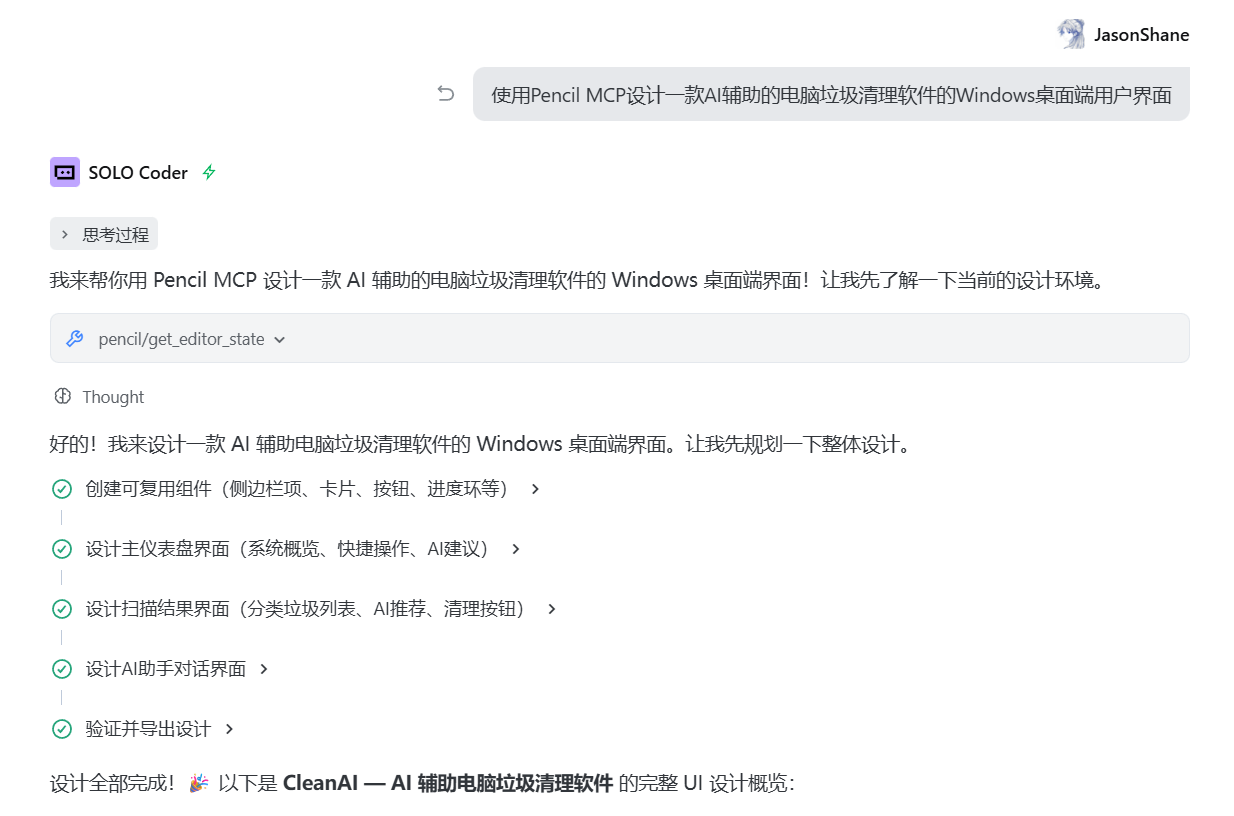 前几天写了一篇 TRAE + Pencil丨(喂饭级教程)完全免费让AI加速UI/UX设计教学了在TRAE中如何借助Pencil插件调用TRAE内置大模型免费设计UI,昨天做了一个AI辅助的垃圾清理软件 三小时从零开始SOLO出一款Windows端AI辅助垃圾清理软件,但是整体UI界面我并不满意,所以昨晚又借助TRAE + Pencil全新设计一套UI界面,顺道把全流程拆解分享一下。
