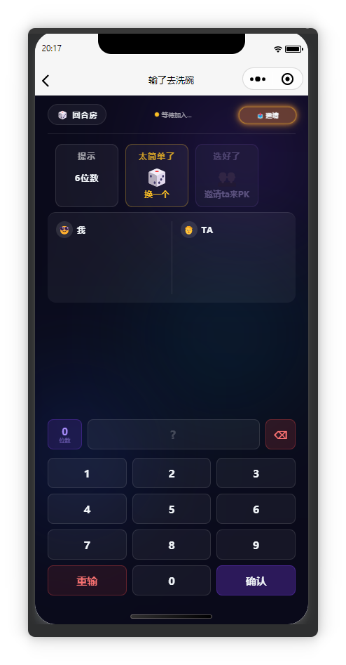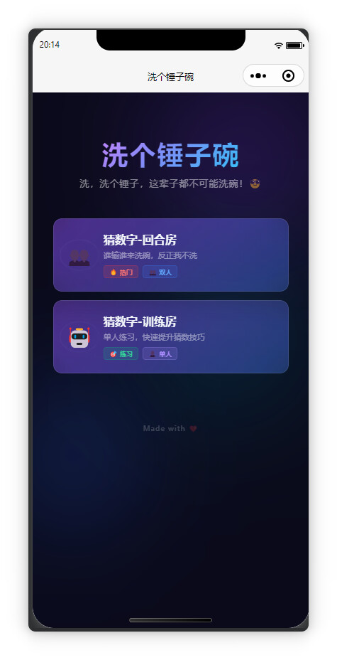 上周看到社区里有人做了个微信小程序: 谁输谁洗碗 ,试玩了下,觉得很有意思,就想自己也搞一个,总算周末有时间了,从昨天周六开始,到今天周日中午终于调通了一个感觉差不多可以玩起来了的小程序: 洗个锤子碗 起名借鉴了大佬的创意,向 大佬 致敬