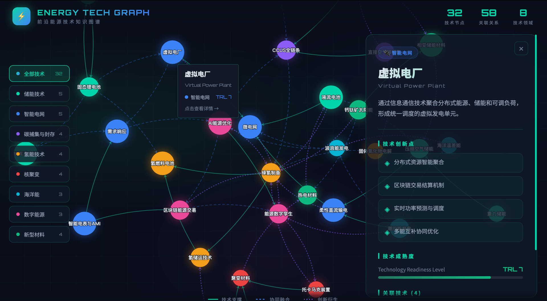 上图展示了知识图谱的完整界面:左侧为 8 大技术领域筛选面板,中央为力导向关系图谱,右侧为点击「虚拟电厂」节点后弹出的详情面板,包含技术描述、创新点、TRL 成熟度及关联技术。