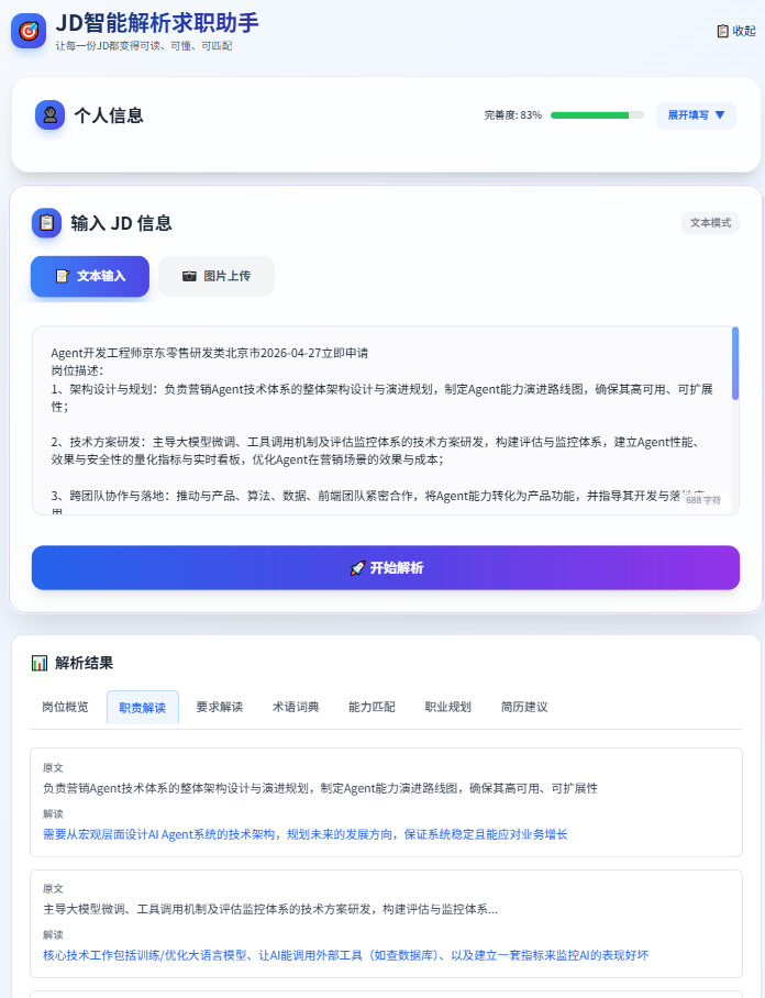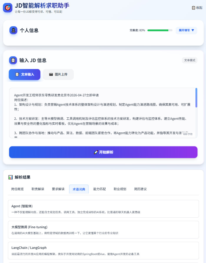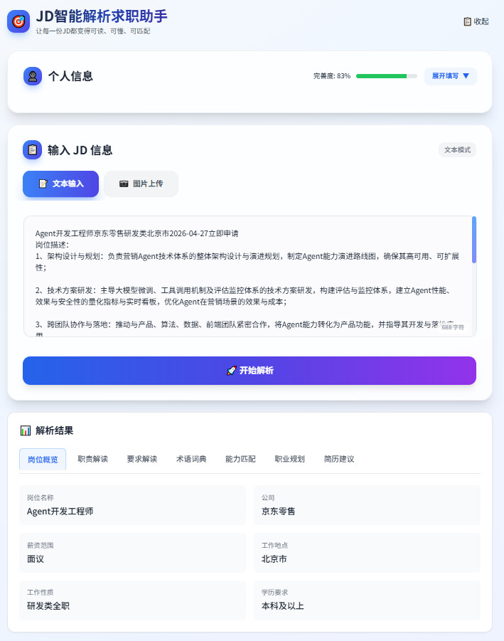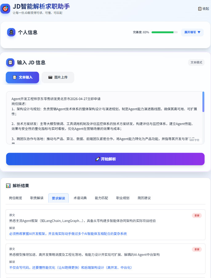 作品介绍 :面向在校大学生及应届毕业生的AI驱动型求职辅助工具,开箱即用。把招聘要求复制进去,或者截图上传,再填一下自己的专业、技能、实习经历,就能解锁岗位密码: