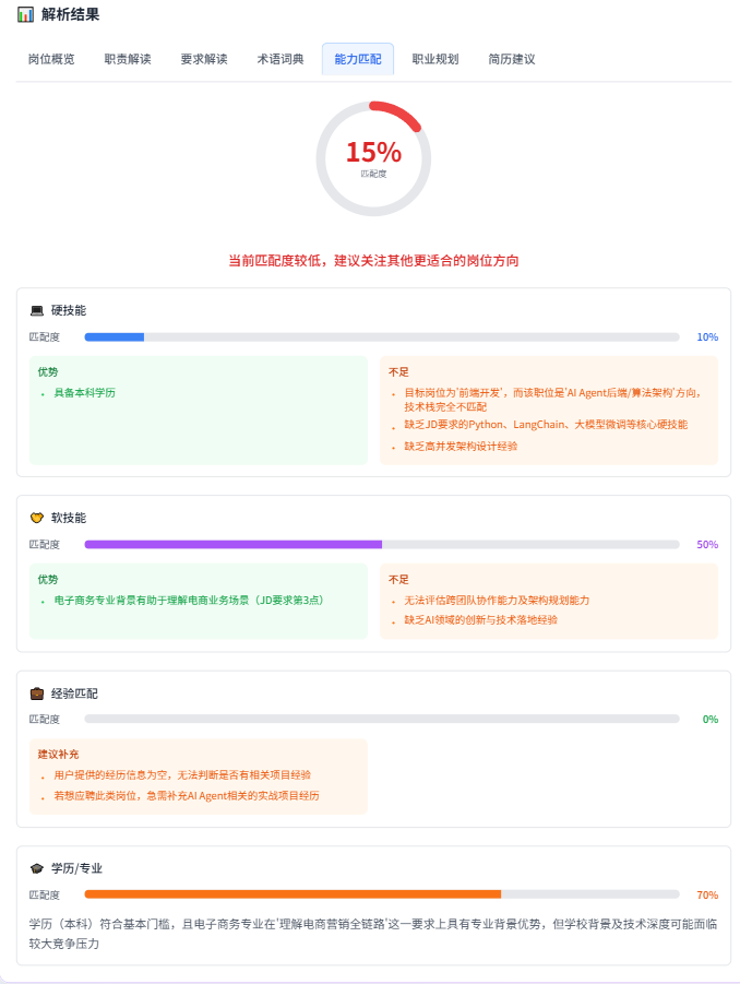 - 能力匹配 :直接告诉你和这个岗位有多配,哪里是优势、哪里是短板,一目了然。