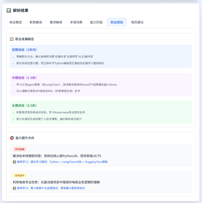 - 职业规划建议 :如果想拿下这个岗位,接下来该学什么、补什么经历,给你指条明路。