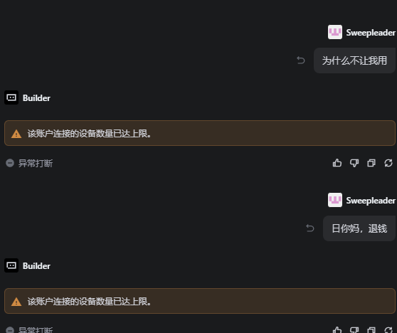 刚充完Ultra,登了四台电脑以后就直接提示该账户连接的设备数量已达上限,但是在主页购买的地方都没有任何提示,可以用几台电脑,都已经用token收费了,难道还要限制设备的使用数量么?好,哪怕是登多了,那我退一个就行了吧,结果还是不能用,终于在文档的一个角落里面写了说频繁登陆设备会封禁24小时,我请问呢?为啥要封禁24小时?Ultra用户400刀的使用量,我请问呢???封禁我24小时,日你妈,退钱!!!!!!!!!!!!速度联系我,日你妈!!!!!!
