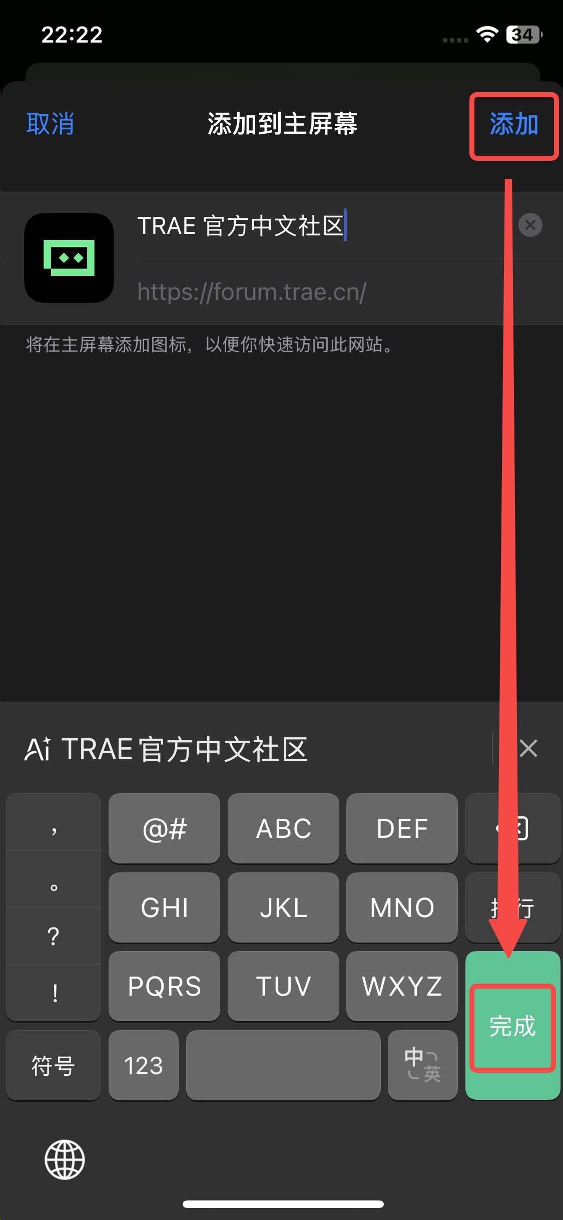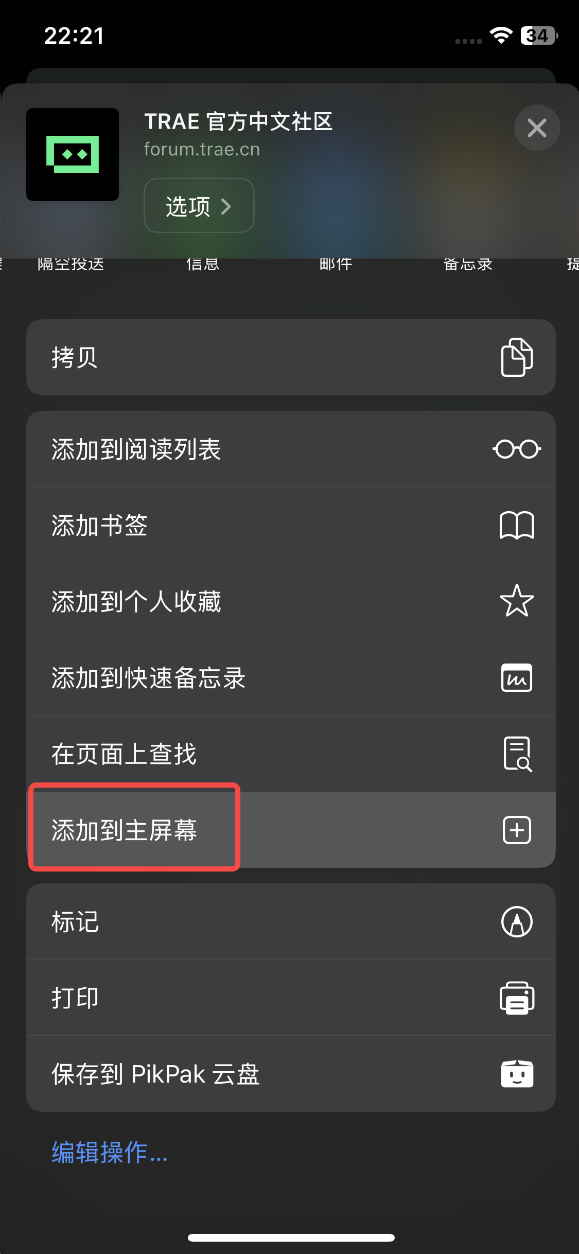 点击“添加到主屏幕”