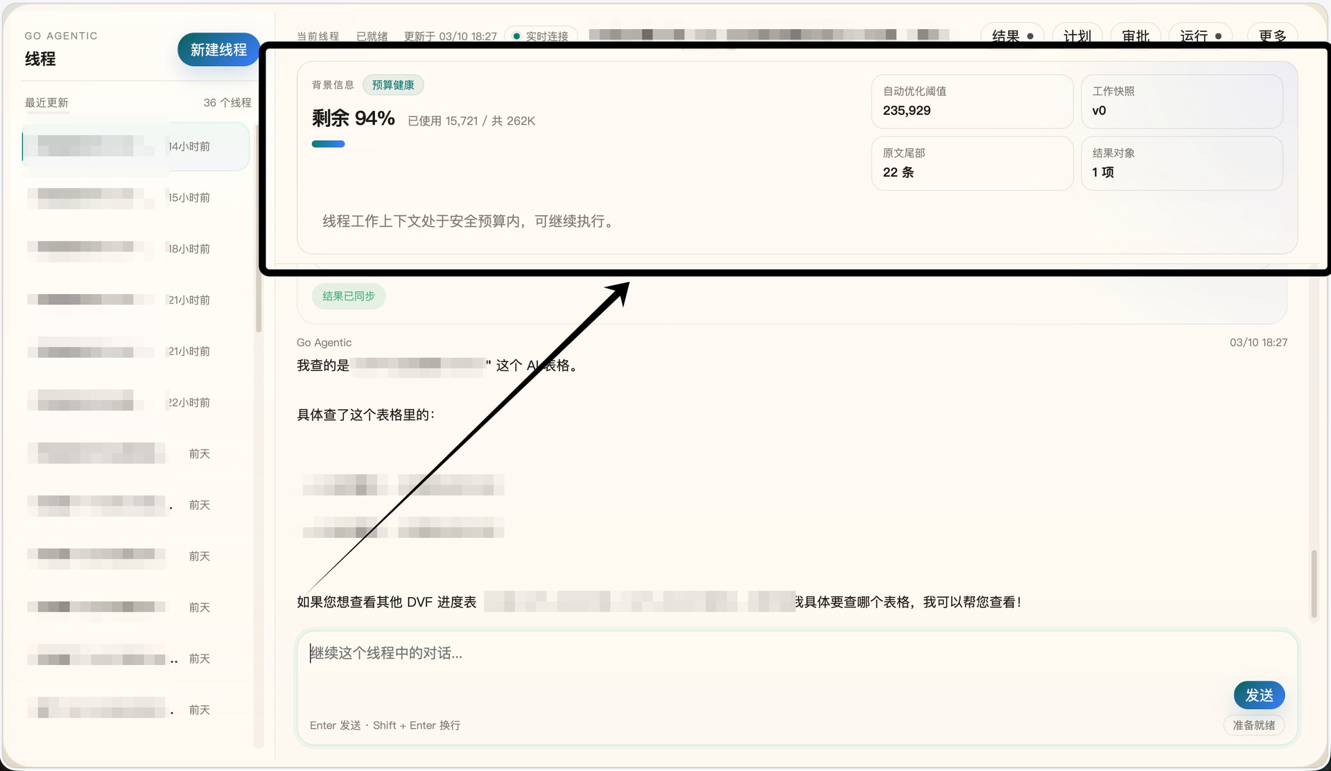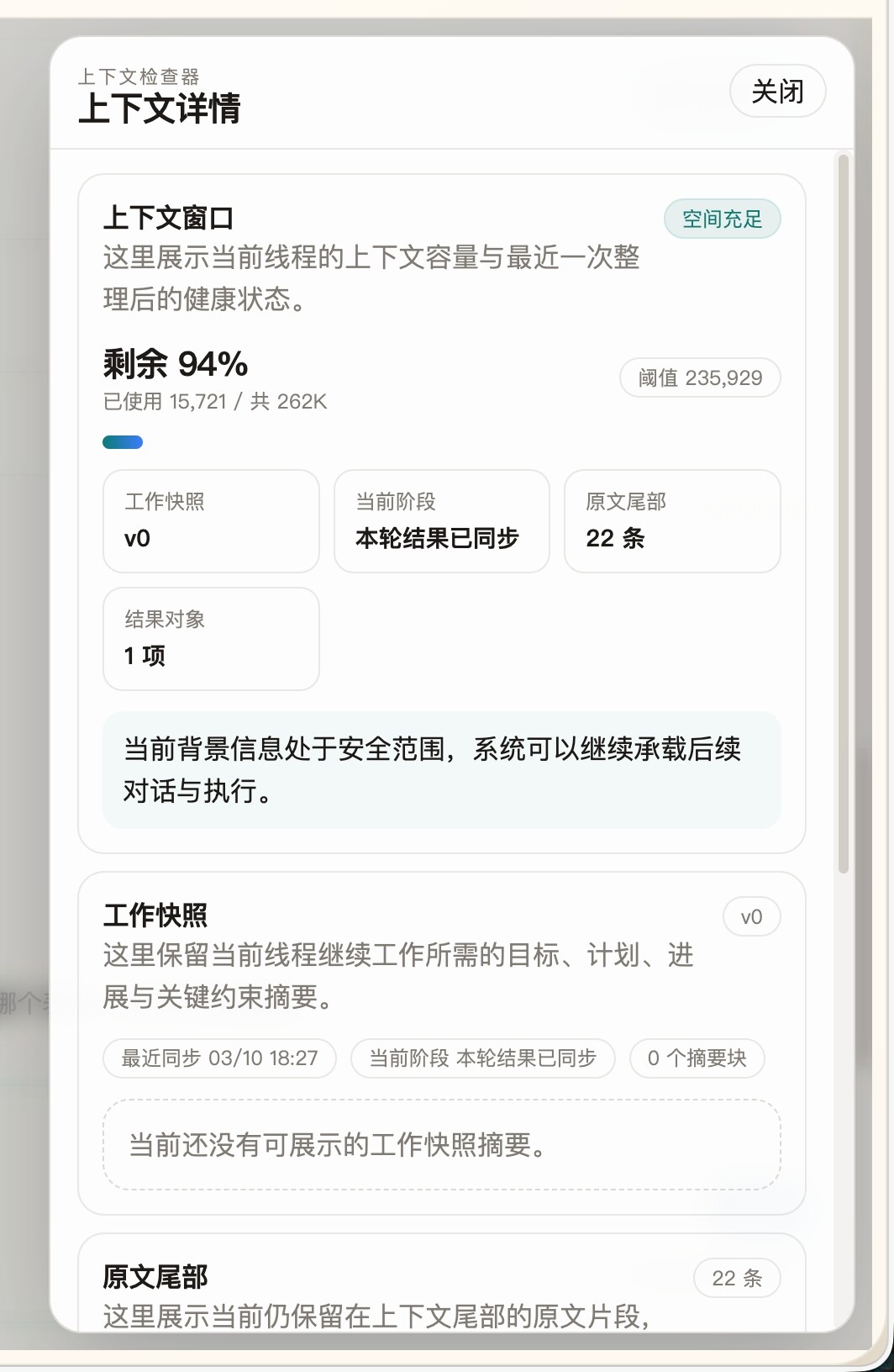 辅助状态:上下文占用、运行预算、压缩状态、快照统计