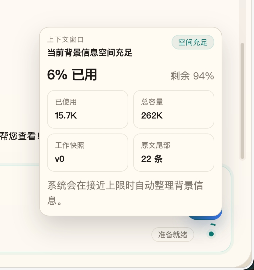 请将当前顶部大面积“背景信息卡片”重构为一个嵌入输入框区域的上下文状态指示器,以更轻量、更克制的方式表达上下文占用情况,并提供按需展开的详情界面。