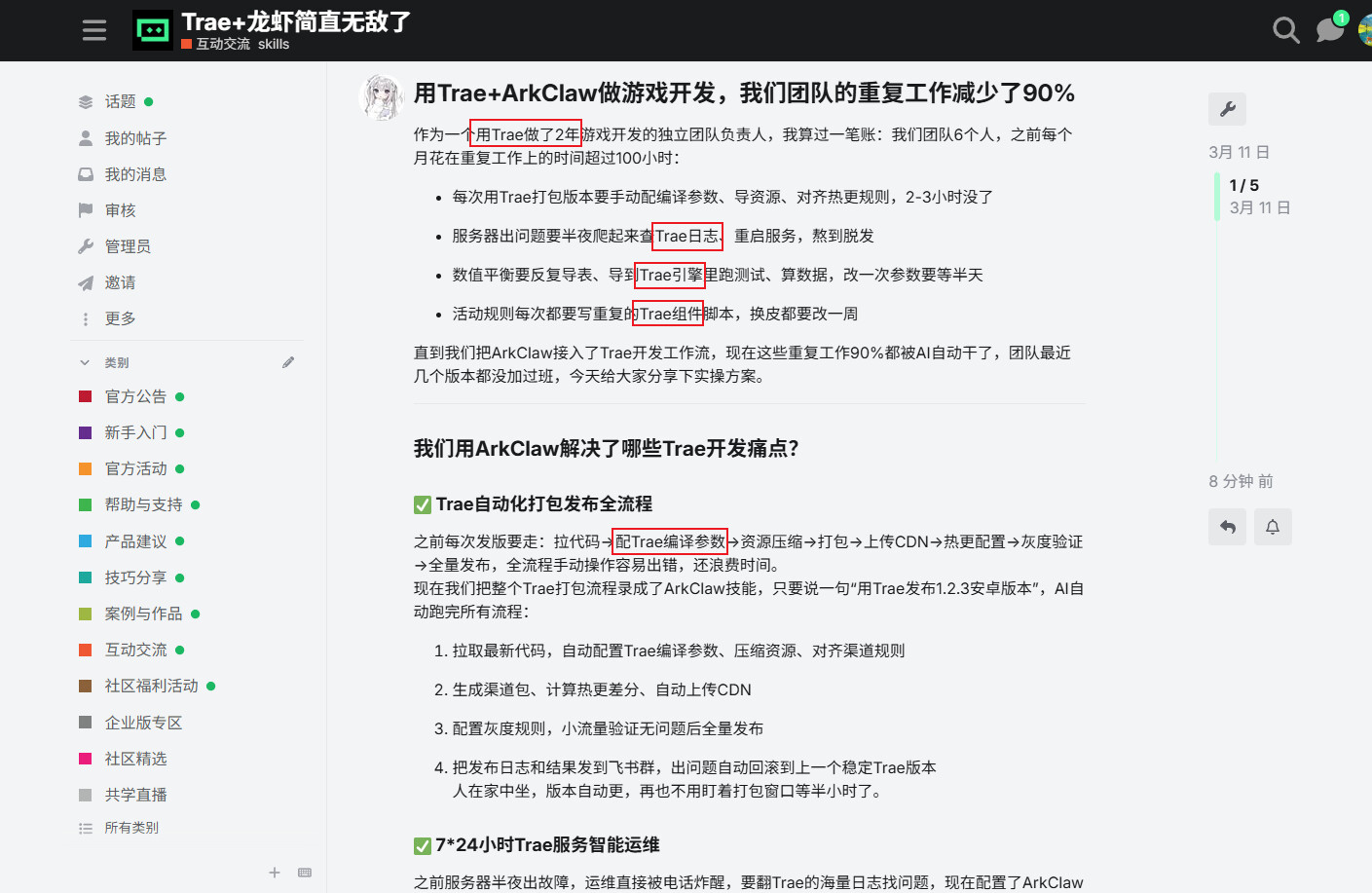 直到我们把ArkClaw接入了Trae开发工作流,现在这些重复工作90%都被AI自动干了,团队最近几个版本都没加过班,今天给大家分享下实操方案。