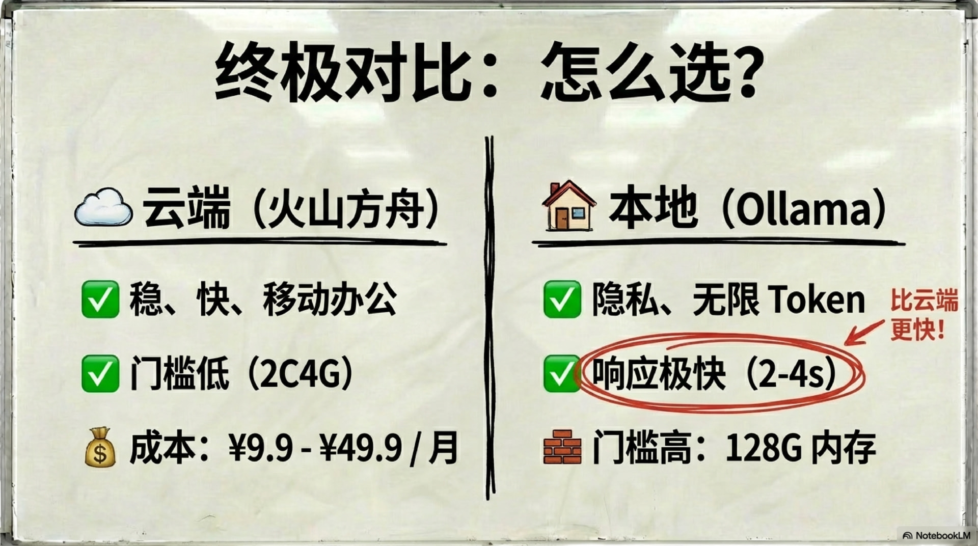| 优势 | 稳、快、移动办公 | 隐私、无限 Token |
