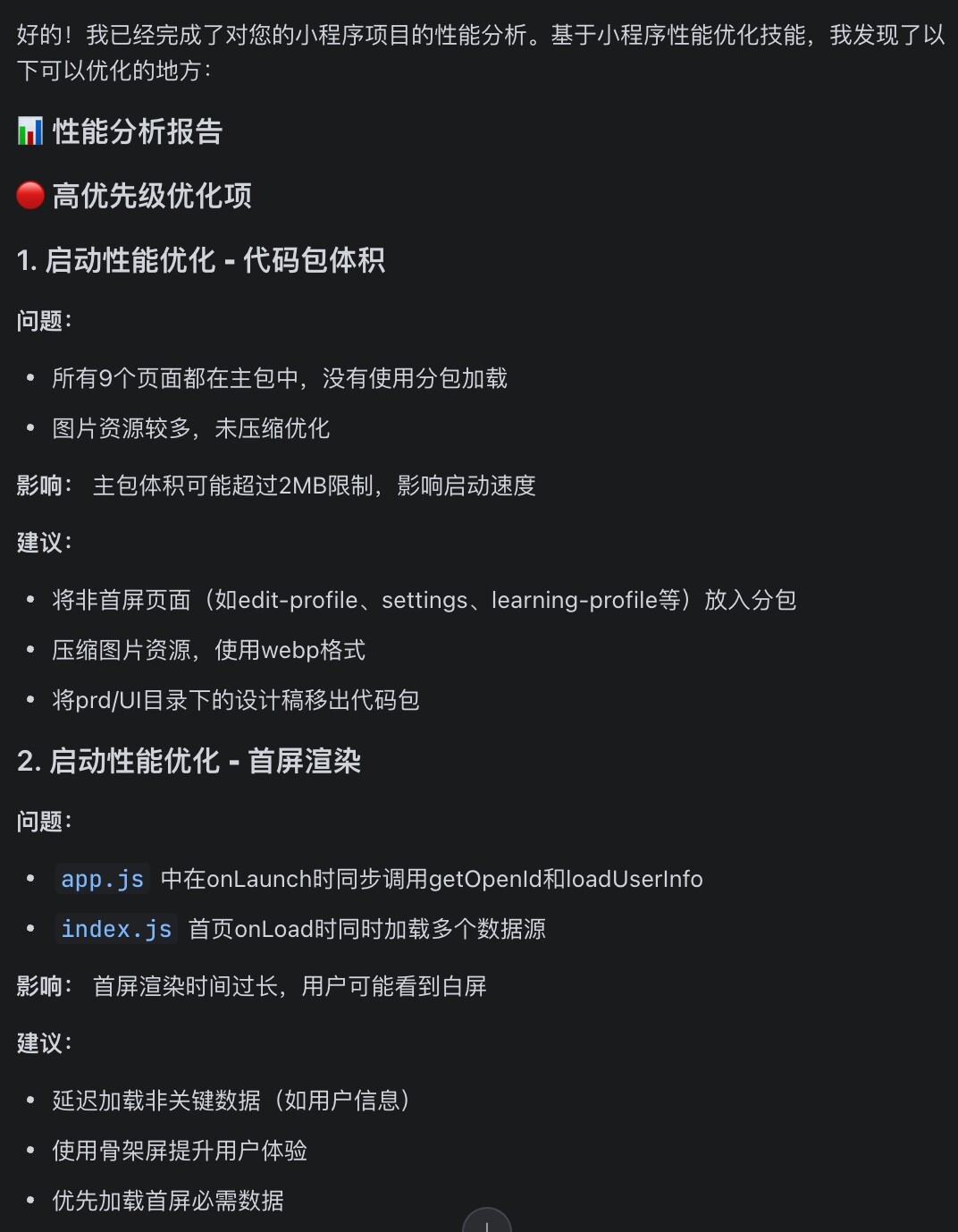 1、功能描述: 识别小程序代码中的性能瓶颈,并提供优化建议。覆盖启动性能和运行时性能两大核心领域。