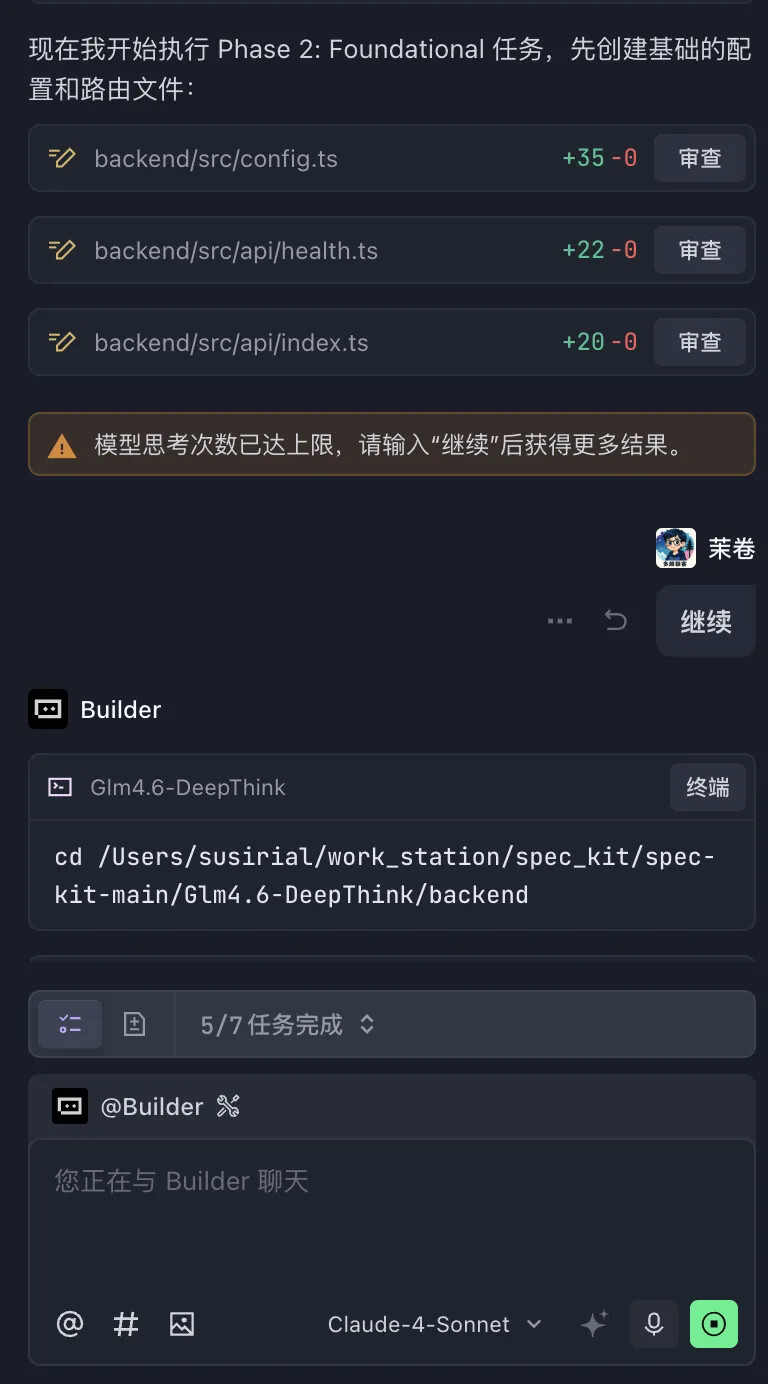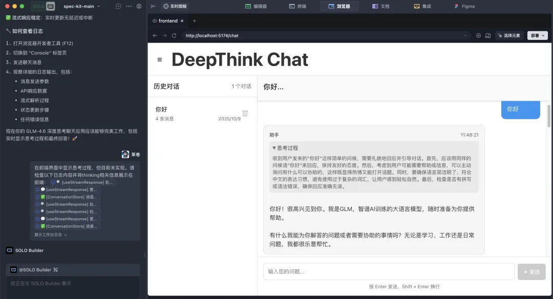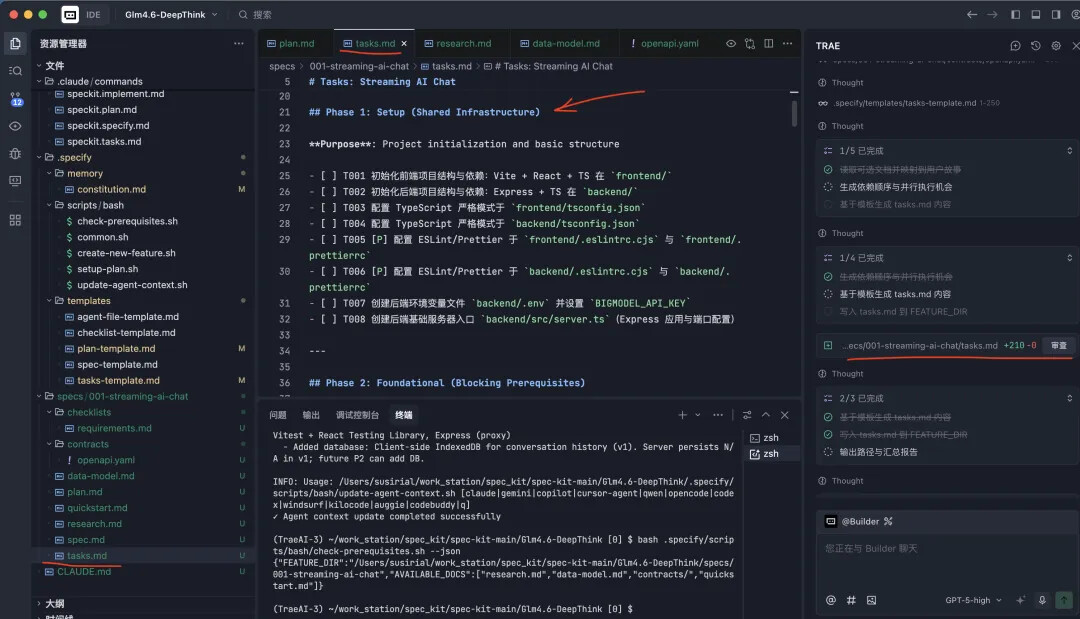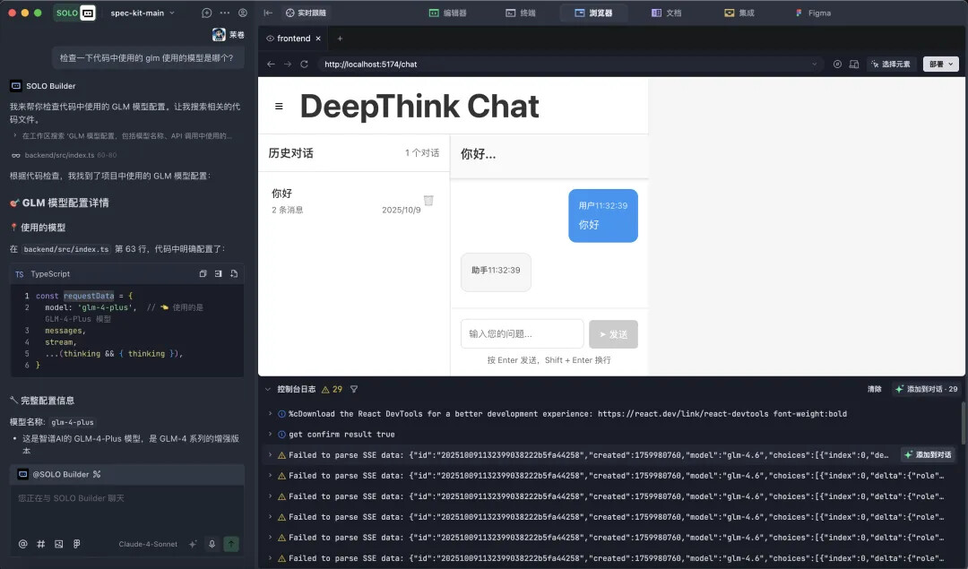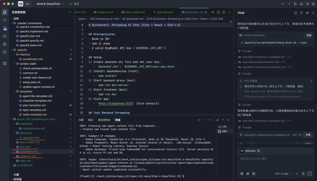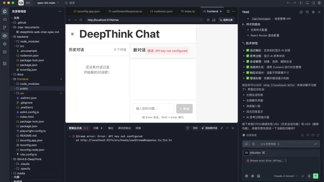 本案例将利用 GLM-4.6 模型构建一个类似 DeepSeek 的前端 AI 对话页面,支持深度思考和流式输出功能。通过这个实际项目,我们将深入了解 Spec Kit 的五个关键命令的使用方法。