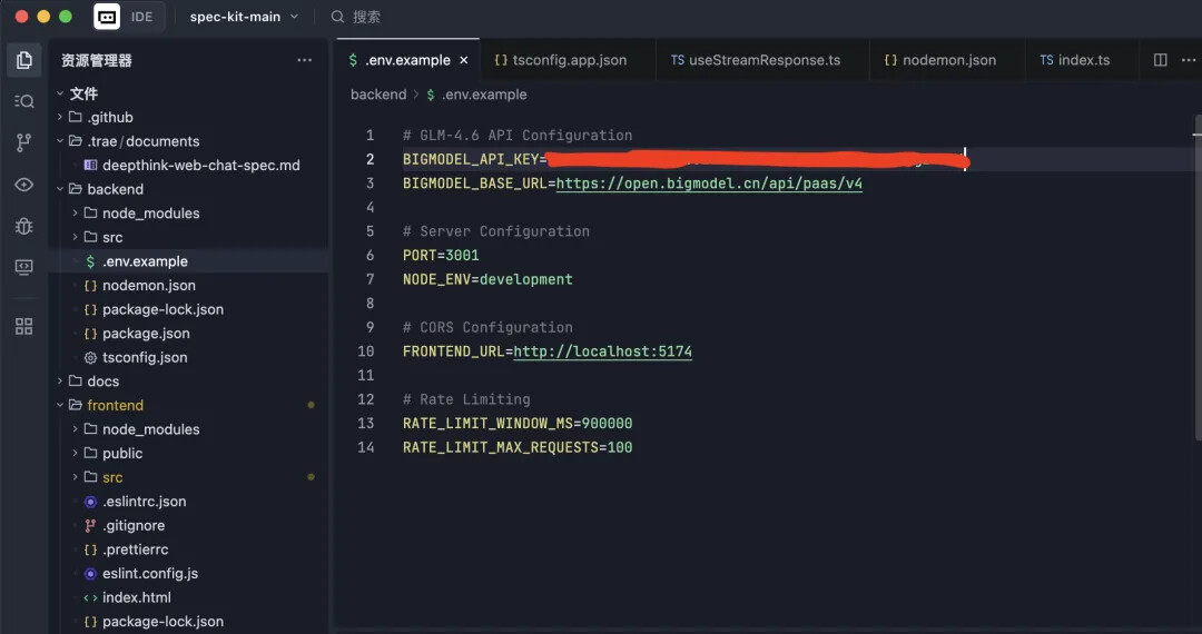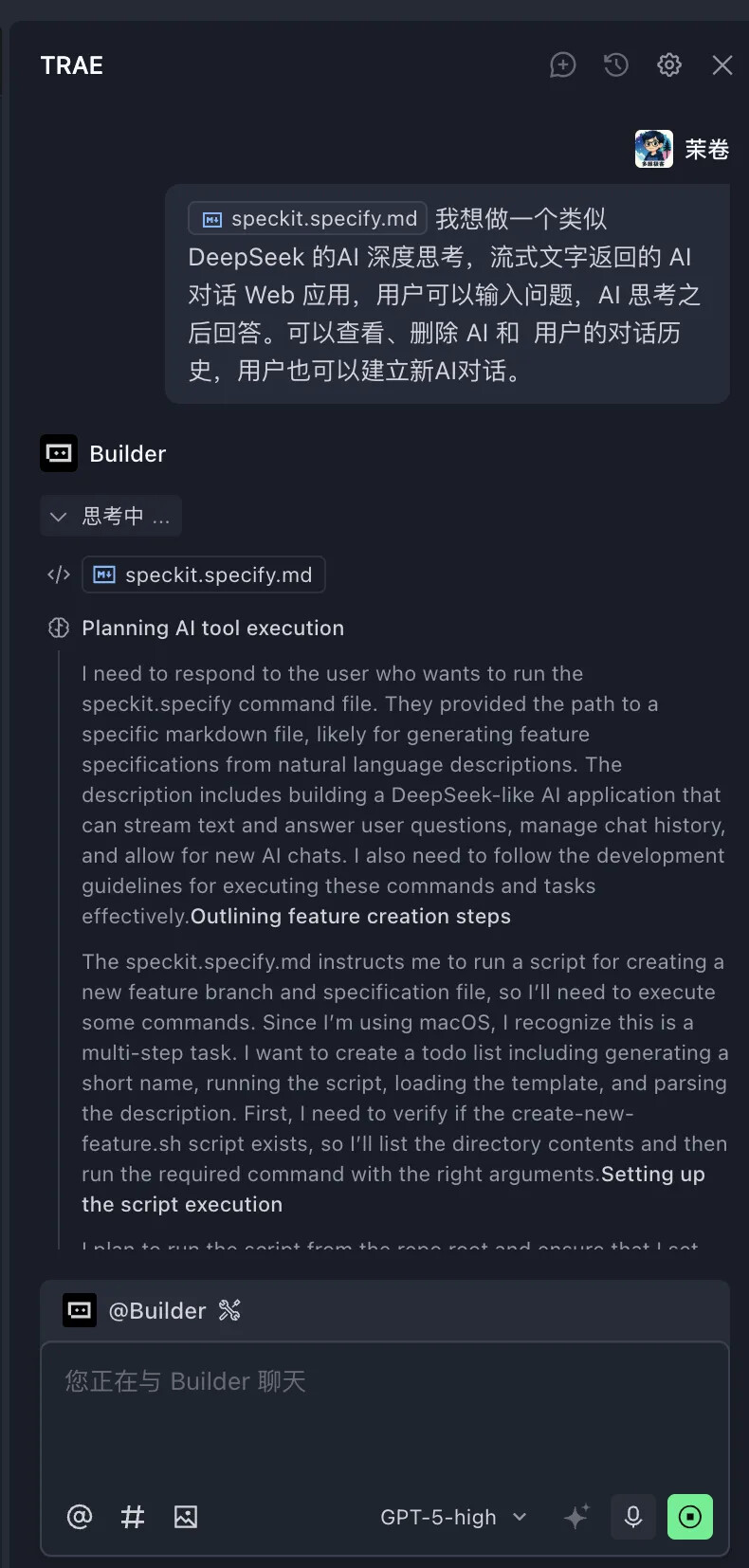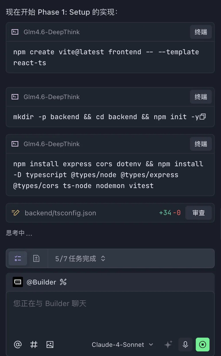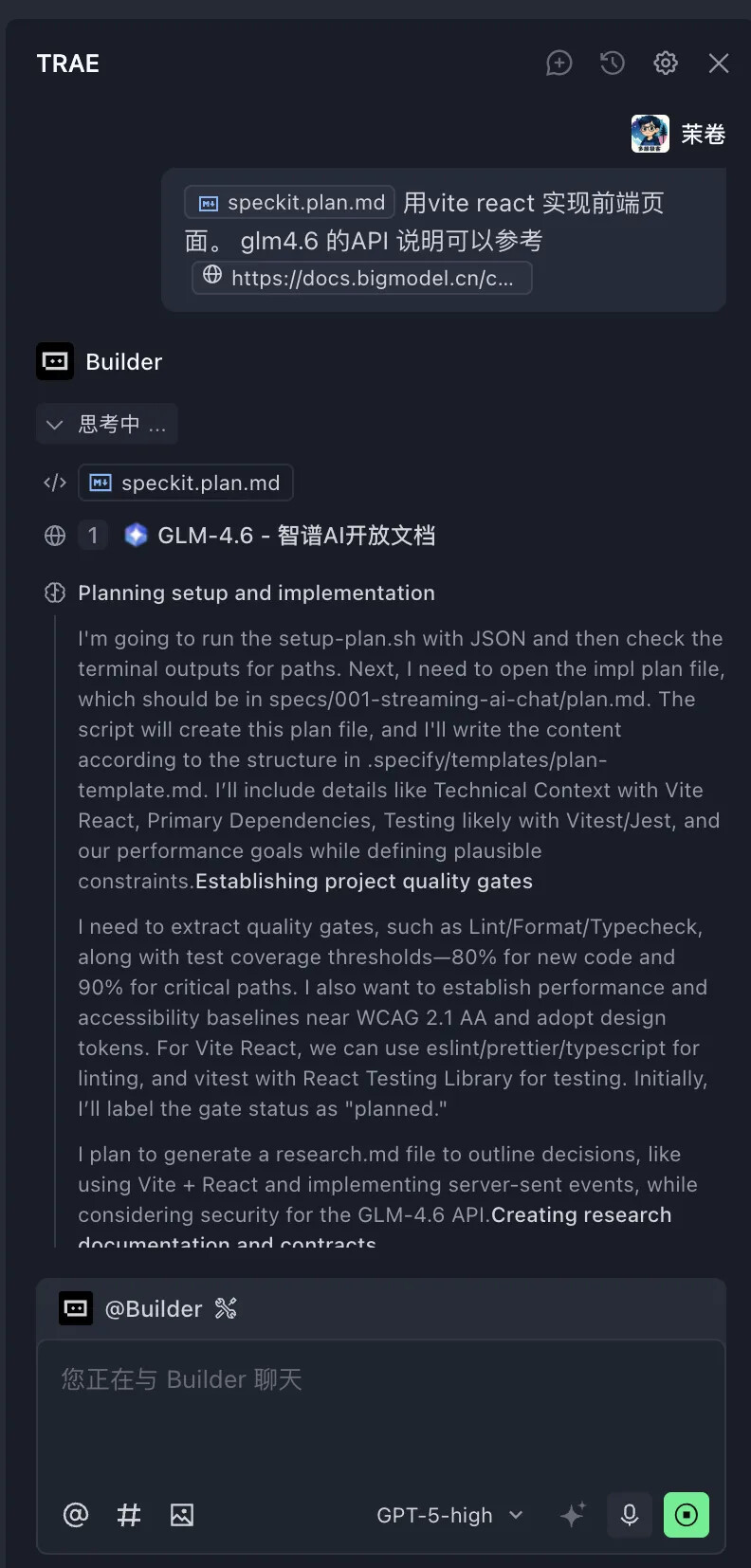 本案例将利用 GLM-4.6 模型构建一个类似 DeepSeek 的前端 AI 对话页面,支持深度思考和流式输出功能。通过这个实际项目,我们将深入了解 Spec Kit 的五个关键命令的使用方法。