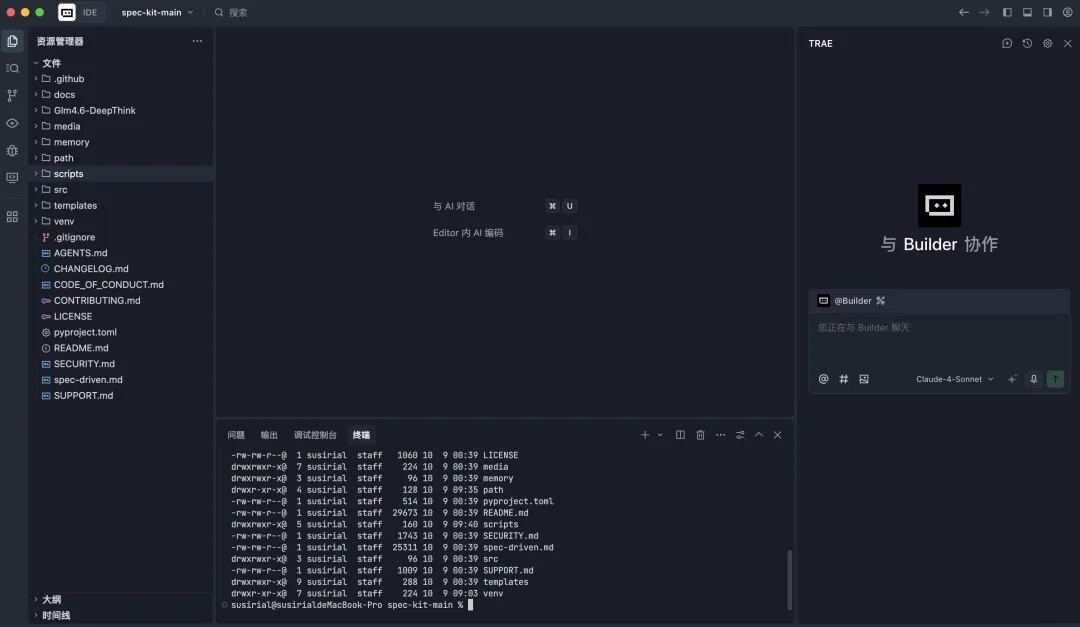 使用 TRAE 进入项目目录,无需激活之前的虚拟环境: