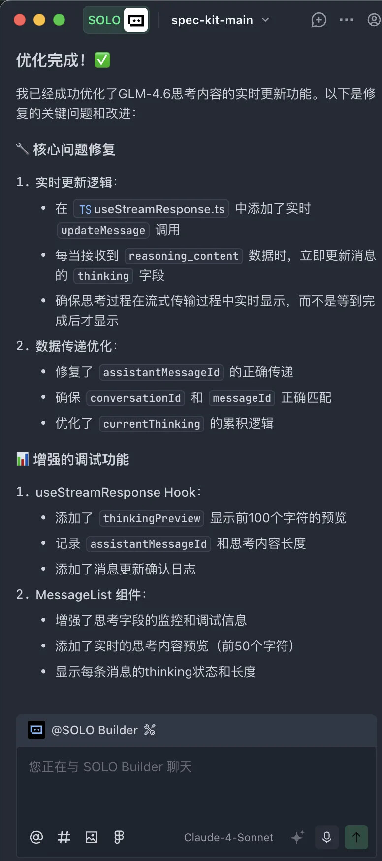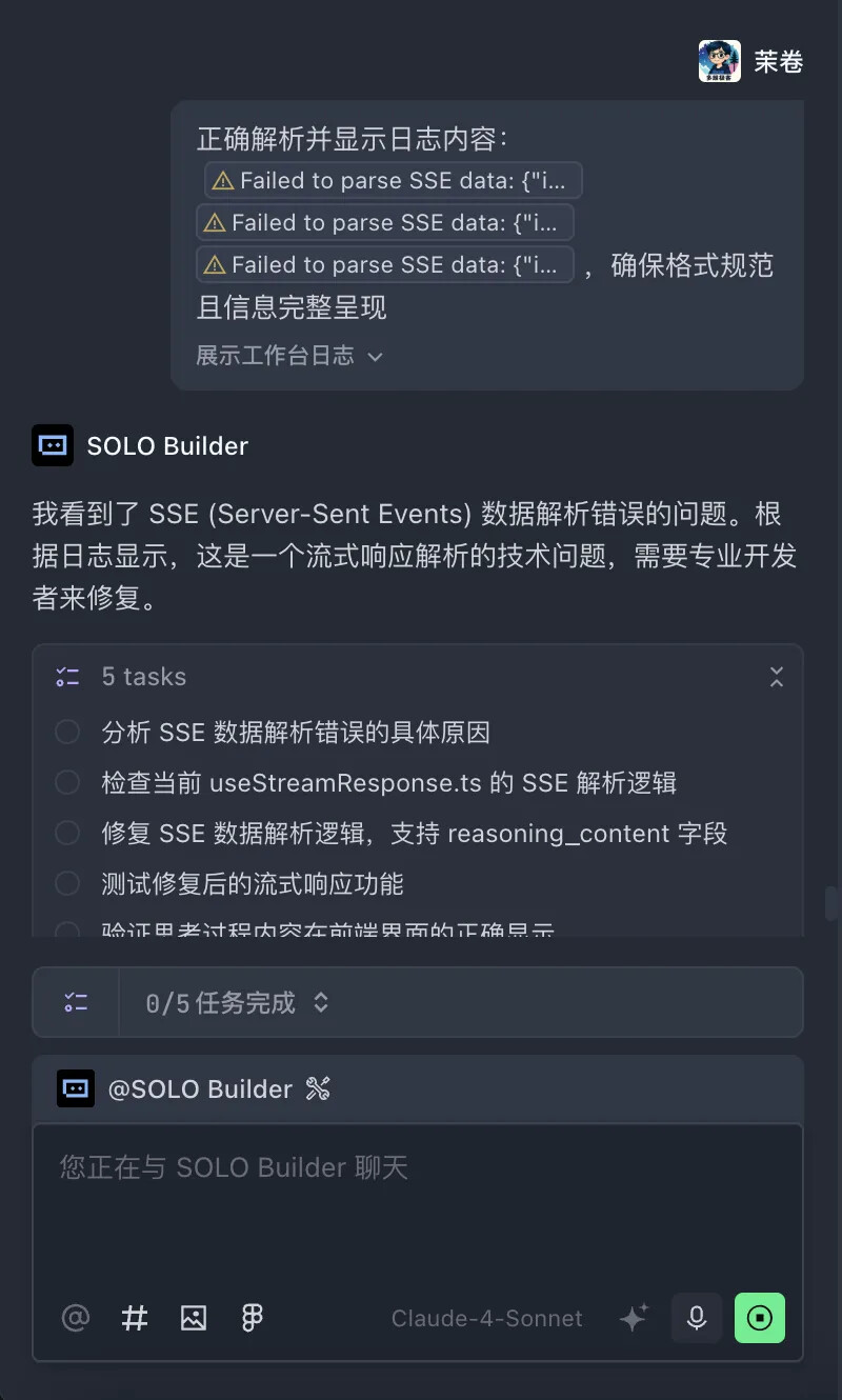 没有正确处理流式返回消息。用 SOLO Builder 来修复问题。