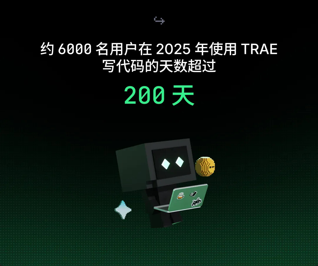 - 约 6000 名用户在 2025 年使用 TRAE 写代码的天数超过 200 天,这些用户也代表了最早注册、连续活跃的一批忠实用户。