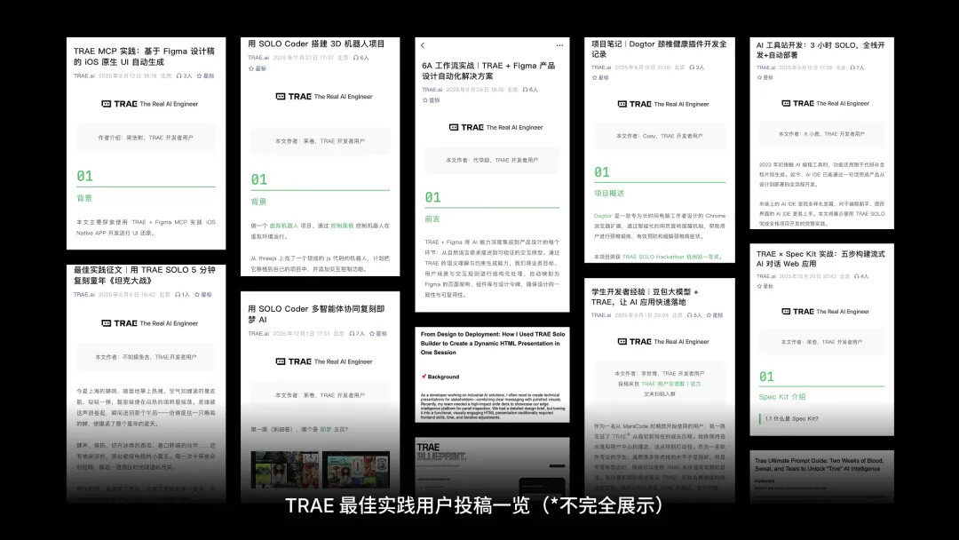 - 超过 200 篇来自全球 TRAE 开发者社区的最佳实践投稿,同样验证了 TRAE 在提升效率、赋能开发上的核心价值。