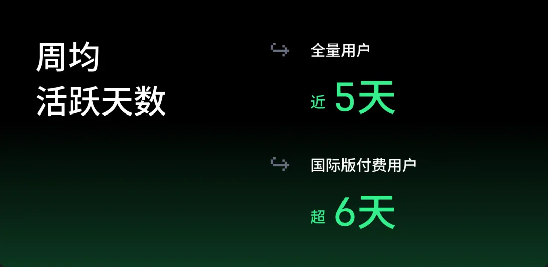- TRAE 用户中的周均活跃天数近 5 天,工作日全勤;其中,国际版付费用户的周均活跃天数超过 6 天,实现自然周全勤。