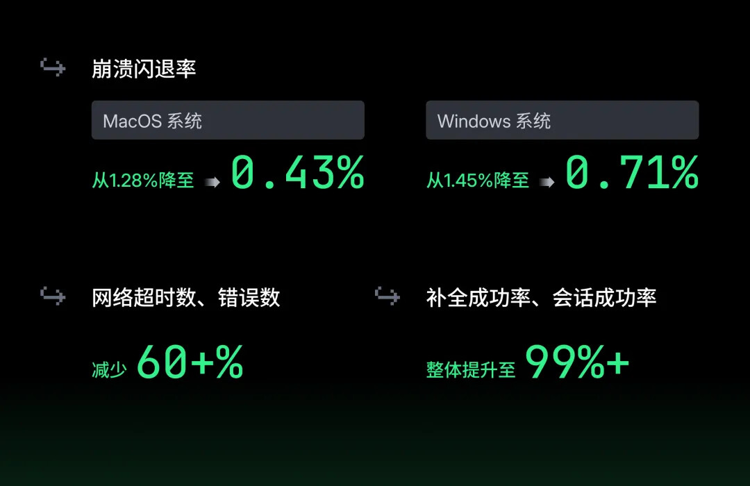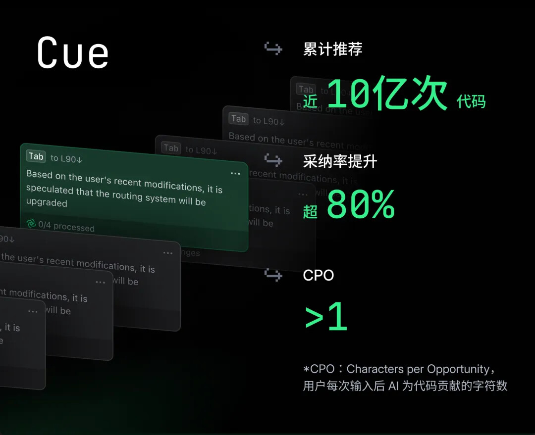 关键指标 CPO >1,意味着用户的每一次 Typing 都可以稳定获得有效的 AI 编码建议,真正为用户手写代码带来了效率提升。(*CPO:Characters per Opportunity,用户每次输入后 AI 为代码贡献的字符数)