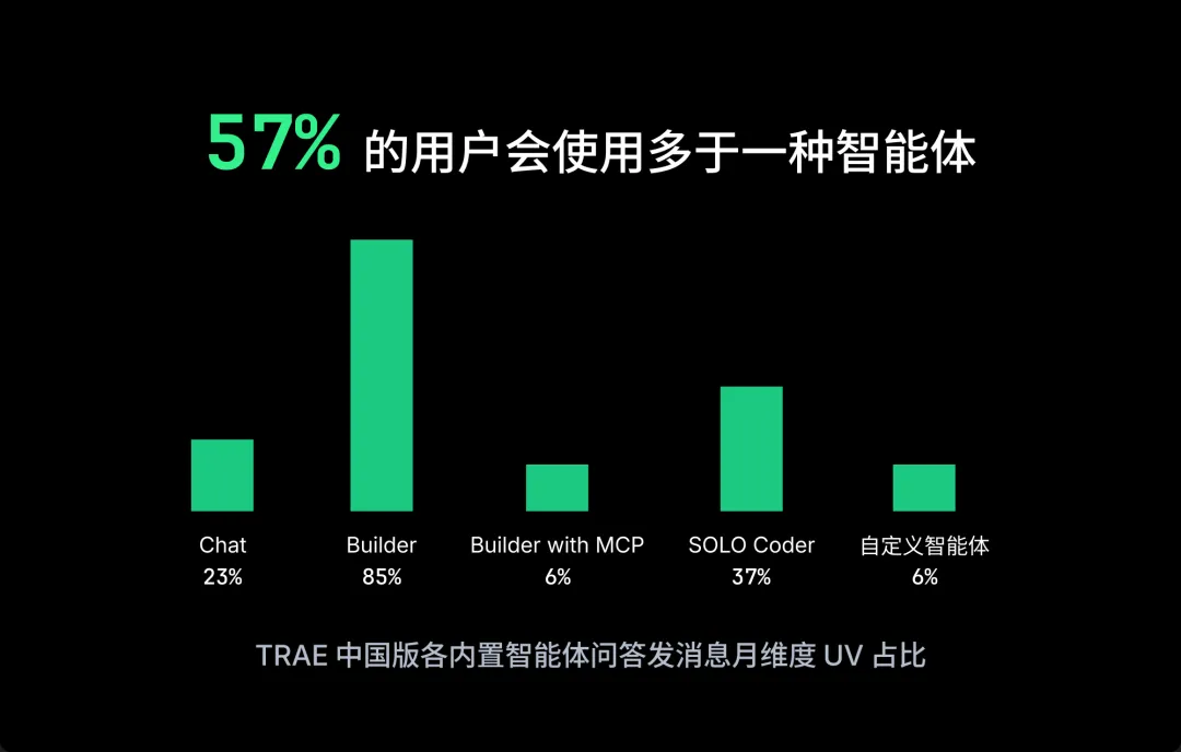 - 越来越多的用户会倾向于使用多种内置智能体解决不同的问题,也会根据需求创建自定义智能体。目前 TRAE 中累计成功创建/编辑更新的自定义智能体达 36.5 万个。