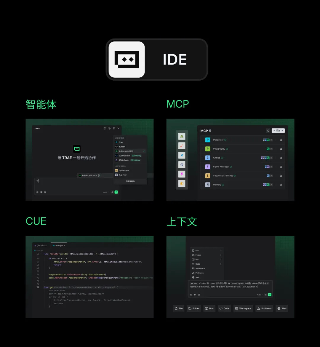 通过 TRAE 智能体、MCP 生态,以及丰富的上下文类型,用户与 AI 的协作更智能、更深度,可以更高效地完成跨任务、跨工具的项目开发。